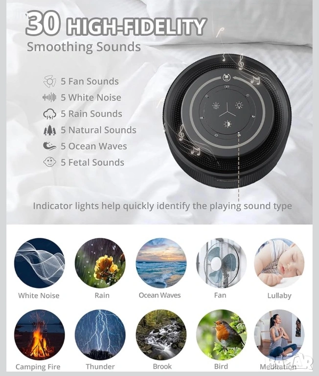 Функционалност: Включва различни звукови режими, регулиране на силата на звука и таймер.