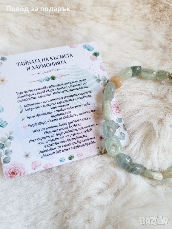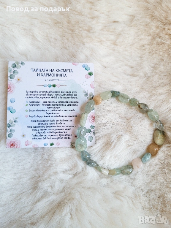 Съчетава аквамарин, амазонит, зелен авантюрин и розов кварц – камъни, свързвани със спокойствие, хармония, любов и вътрешен баланс.
