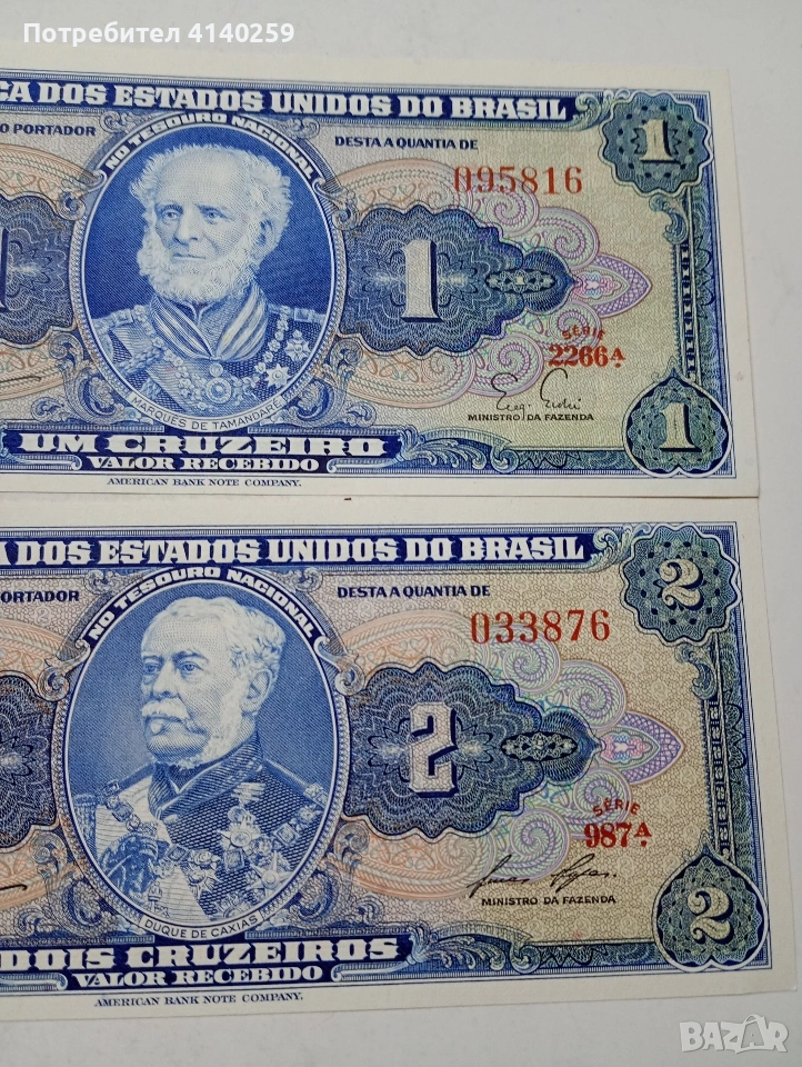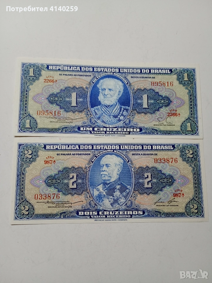 БРАЗИЛИЯ БАНКНОТИ 1 КРУЗЕЙРО 1954 Г 2 КРУЗЕЙРО 1954-1958 Г СЪСТОЯНИЕ НОВО ЦЕНА ЗА 2 БРОЯ ПОЛУЧАВАТЕ СНИМАНИТЕ БАНКНОТИ РАЗГЛЕДАЙТЕ ДРУГИТЕ МИ ОБЯВИ ДА КОМБИНИРАТЕ ДОСТАВКА ЕКОНТ ЗА ВАРНА ЛИЧНО