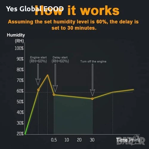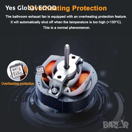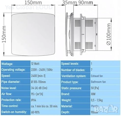 Вентилатор за баня с диаметър 100 mm, оборудван със сензор за влажност, функция за забавено изключване (overrun таймер) и клапа против обратен въздух. Осигурява ефективна вентилация и отвеждане на влагата от помещението.
