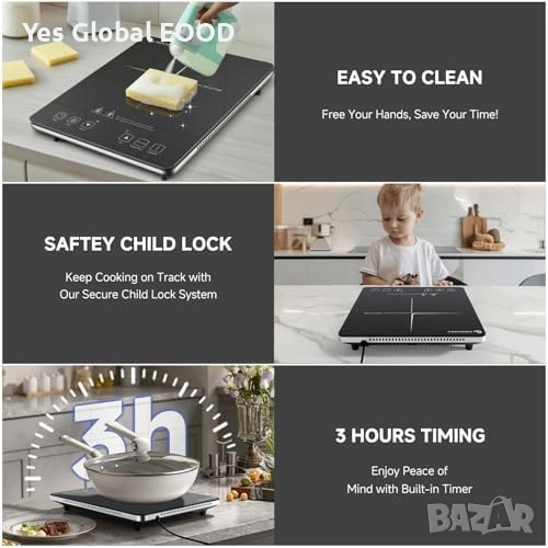 Оборудван с таймер до 3 часа и защитно заключване (safety lock) за по-безопасна работа. Подходящ за домашна кухня, малки апартаменти, офис или къмпинг.