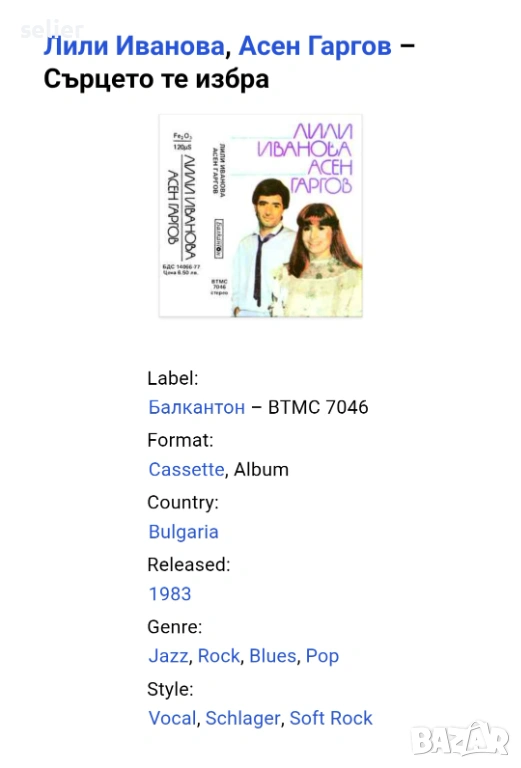 Лили Иванова, Асен Гаргов – Сърцето те избра Оригинална касетка-чисто нова Балкантон 1983г Само за р → Обява 53736112