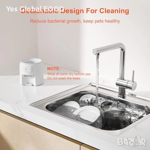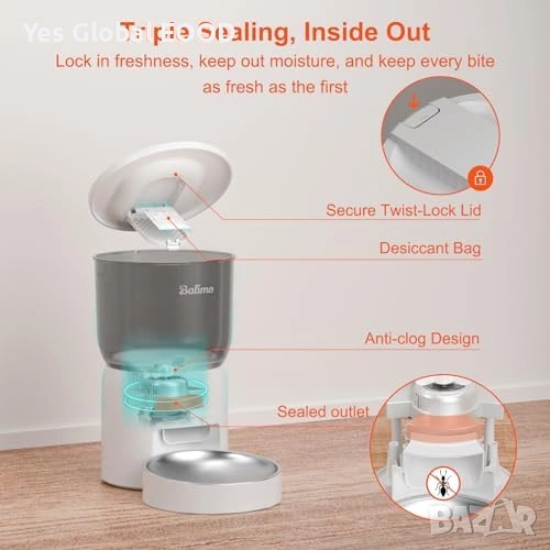 Интелигентна автоматична хранилка Balimo 3L с WiFi връзка (2.4G), предназначена за котки и малки кучета. Позволява управление чрез мобилно приложение и програмиране на хранене от 1 до 10 хранения на ден.