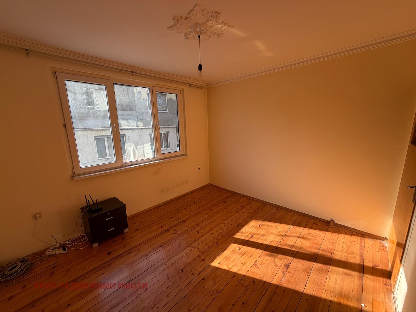 Тристаен апартамент, тухла от 70те години, просторен, разполага с голям хол с тераса, две спални, отделна кухня с тераса, баня и тоалетна, антре. Стаите са в добро състояние, стени латекс, подове с естествена дървена настилка, циклени и лакирани, входно антре с венецианска мозайка - фигурално терацо, ПВЦ дограми. Санитарните възли са на теракот и фаянс, не са обновявани, в банята има и вана.
