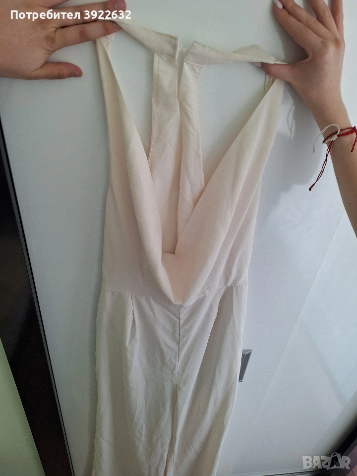 Продавам елегантна дамска рокля в нежен пастелен кремав цвят, размер S. Моделът е много стилен и стои изключително женствено. Дълбоко деколте отпред Ефектен отворен гръб с падащ дизайн Лека и ефирна материя Елегантна кройка, която подчертава фигурата Подходяща за летни събития и специални поводи Подходяща за вечерни излизания, партита, празници или официални събития. Размер: S Състояние: много добро