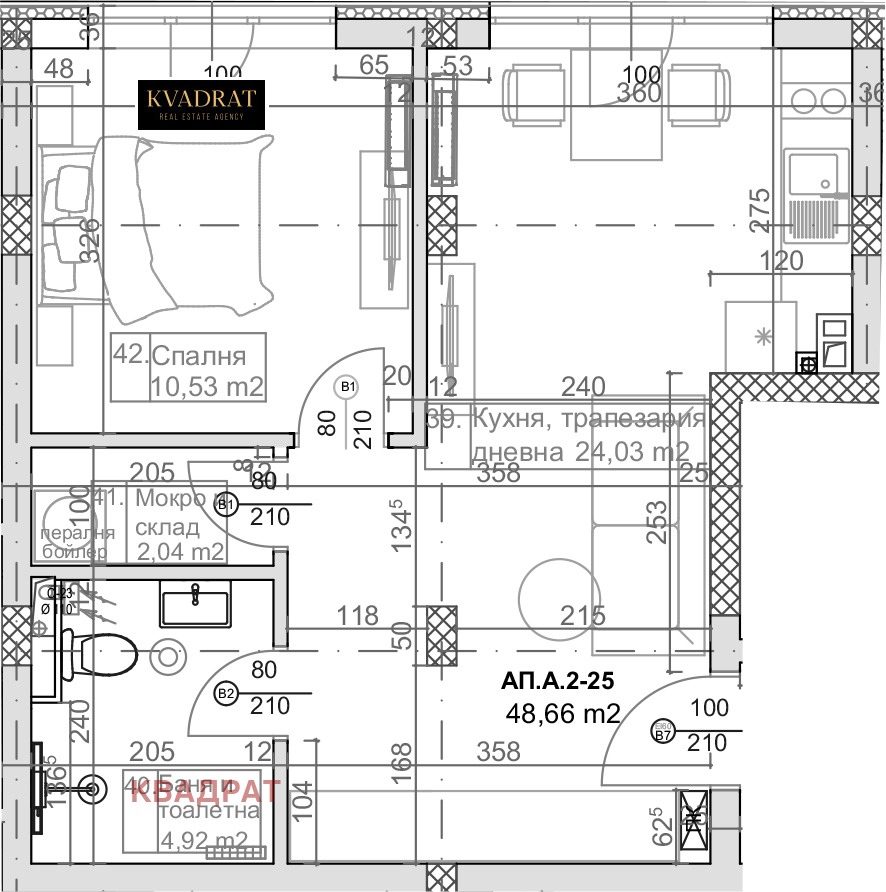 Апартаментът се състои от коридор, килер, баня с тоалетна, дневен тракт с кухненски бокс, една спалня.