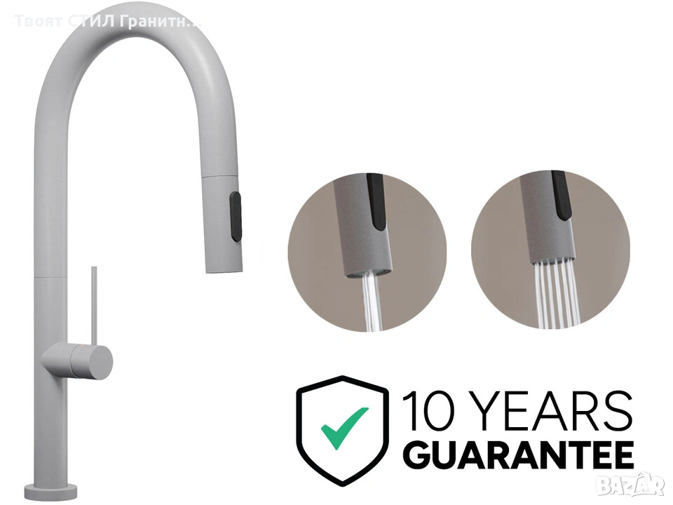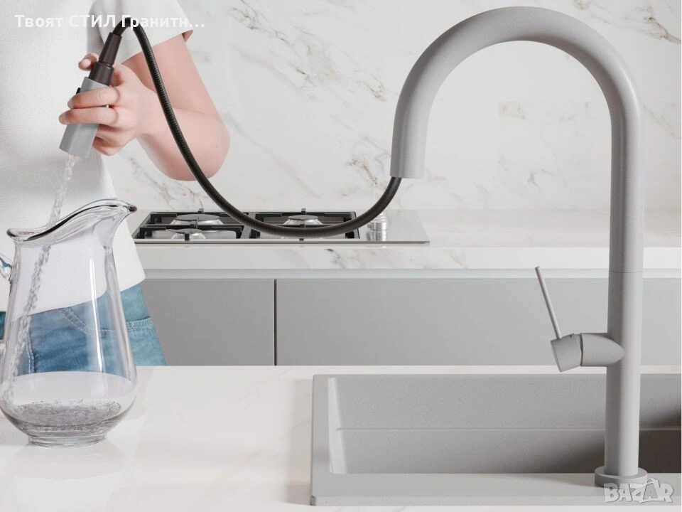 Смесителите са идеални за комбинация с гранитни мивки, дозатори и сифони в същия цвят.