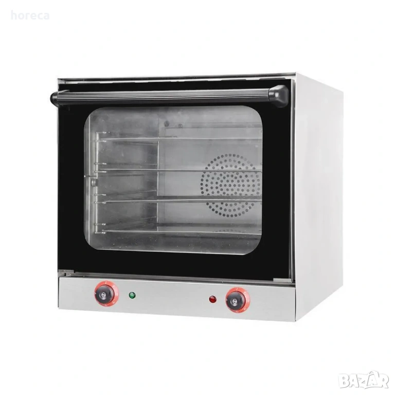 Професионална конвекторна фурна с включени 4 тави осигурява равномерно и бързо печене чрез циркулация на горещ въздух. Двата вентилатора разпределят топлината равномерно, което гарантира отлични резултати при печене на тестени изделия, закуски, месо, зеленчуци и различни ястия.