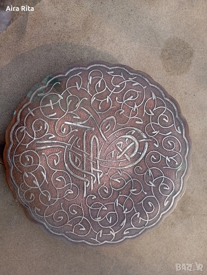 Стар меден поднос,подкован със сребърни букви Техеран -1921г. диаметър 20см.