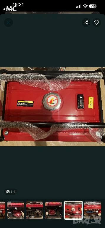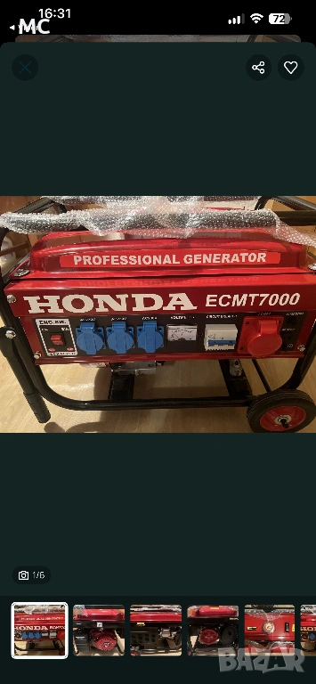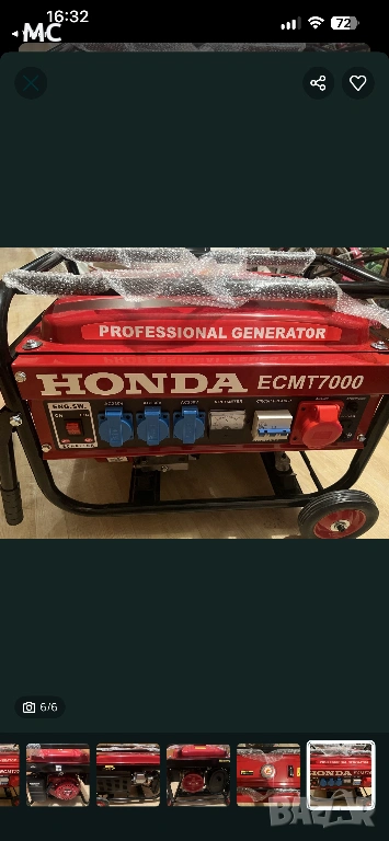 Бензинов генератор за ток HONDA ECMT 7000 е типичен високопроизводителен представител на богатата гама генератори ХОНДА, който се представя на професионалното ниво. Металната тръбна рамка предпазва вътрешните му компоненти и връзки от механични повреди, а големите колела улесняват транспортирането от и до всяка работна площадка. Електрогенераторът не вдига много шум в работен режим. Поради голямата си мощност може да се използва за изпълнение на задачи, свързани с получаване на постоянно захранване с ток. С едно зареждане на резервоара за горивна течност, може да работи до 8 работни часа и 10 минути.