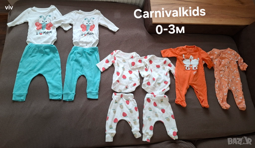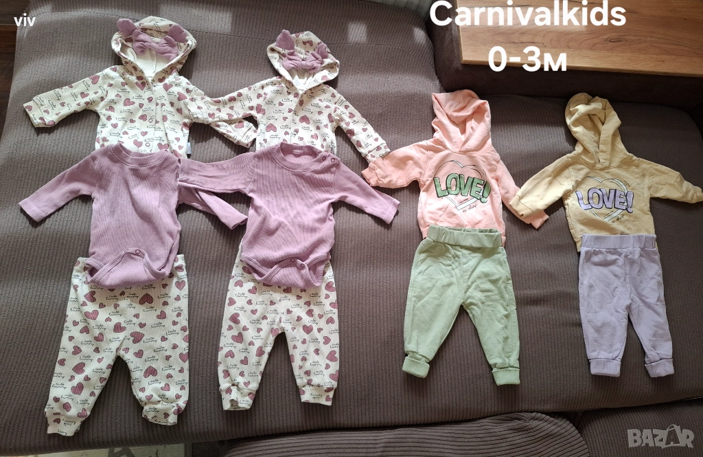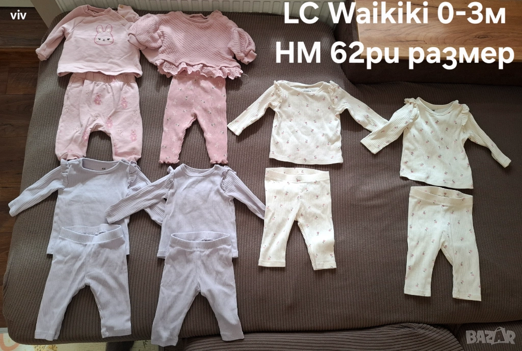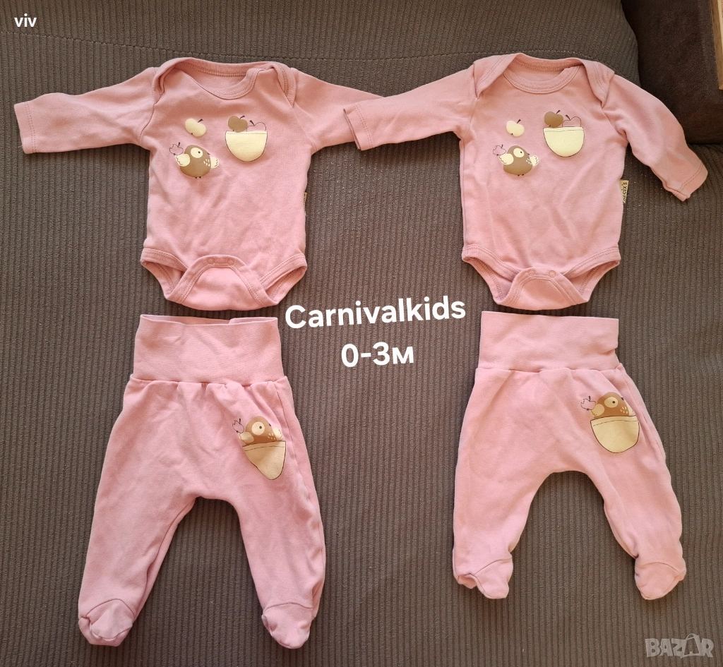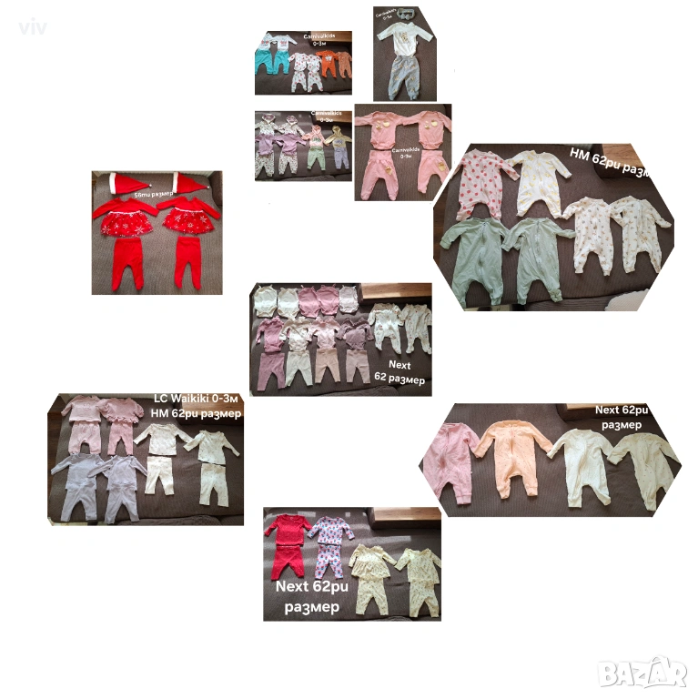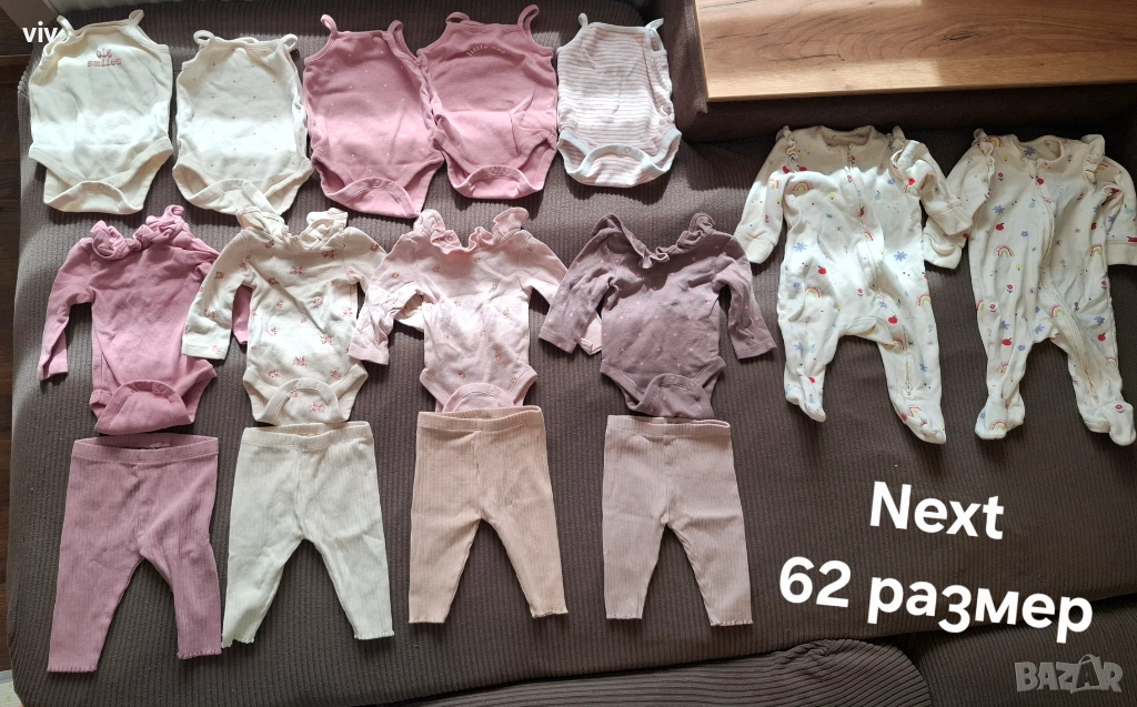 Продавам лот дрешки за момиче, размер 56 - 62ри размер. Марките са Next, LC Waikiki, Carnivalkids. Съдържа четири бодита с дълъг ръкав и четири панталончета на Next, пет бодита с презрамки на Next, два ромпъра на Next, четири комплекта блузи с дълъг ръкав с панталонки на Next, четири пижами с дълъг ръкав на Next, единадесет комплекта с дълъг ръкав и ританки/панталонки от Carnivalkids, два ромпъра от Carnivalkids, шест пижами с дълъг ръкав от HM, четири комплекта блузи с дълъг ръкав и панталони от HM, два комплекта блузи с дълъг ръкав и панталони от LC Waikiki и два коледни комплекта.