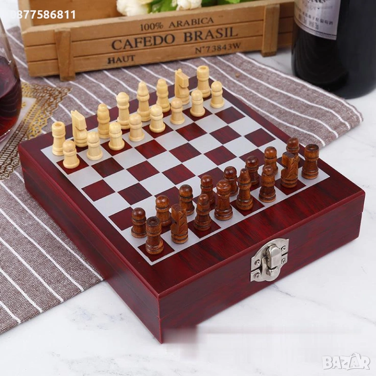 Уникална комбинация за любителите на виното и стратегическите игри! Предлагаме ви комплект за вино в луксозна дървена кутия, чийто капак е и шахматна дъска. Идеален подарък за рожден ден, юбилей или нов дом.