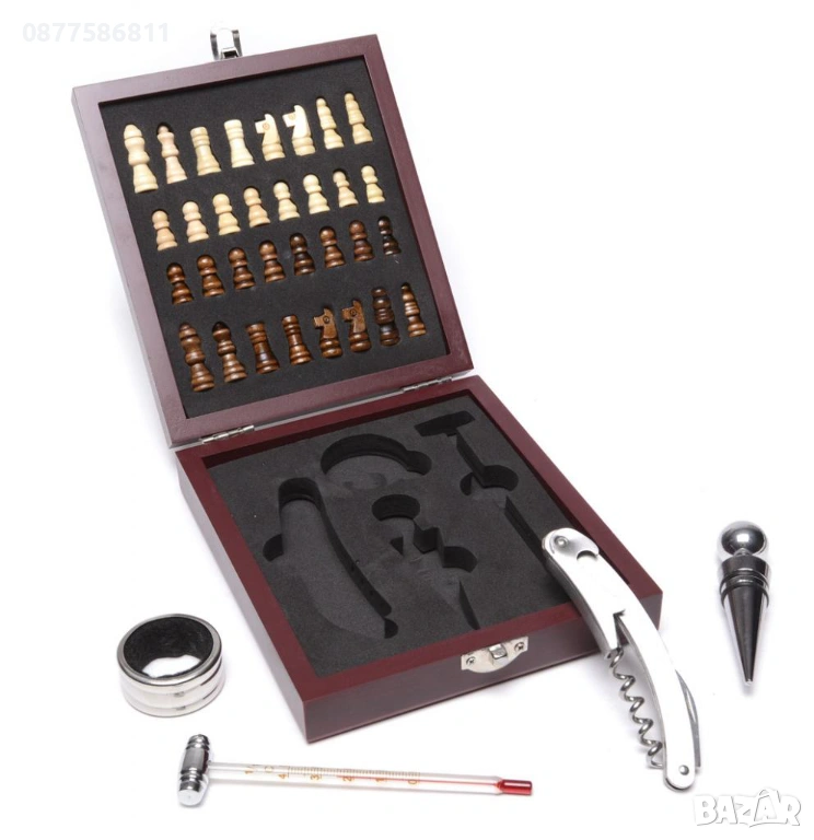 Луксозна кутия с прибори, Ринг за вино, Отварачка за бутилка, Подарък за мъж, Оригинален подарък, Подарък за шахматист.