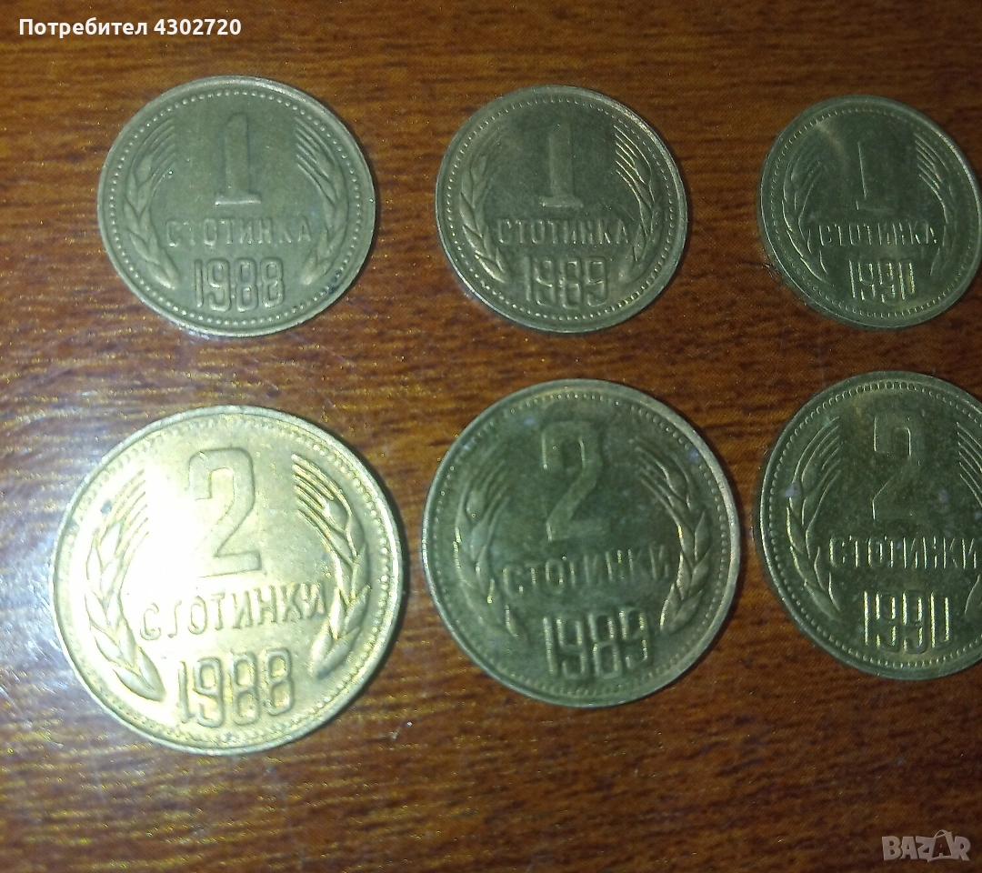 Стари български монети с номинал 1 и 2 стотинки от 1988,1989 и 1990 година. Цена за всичките 10 евро