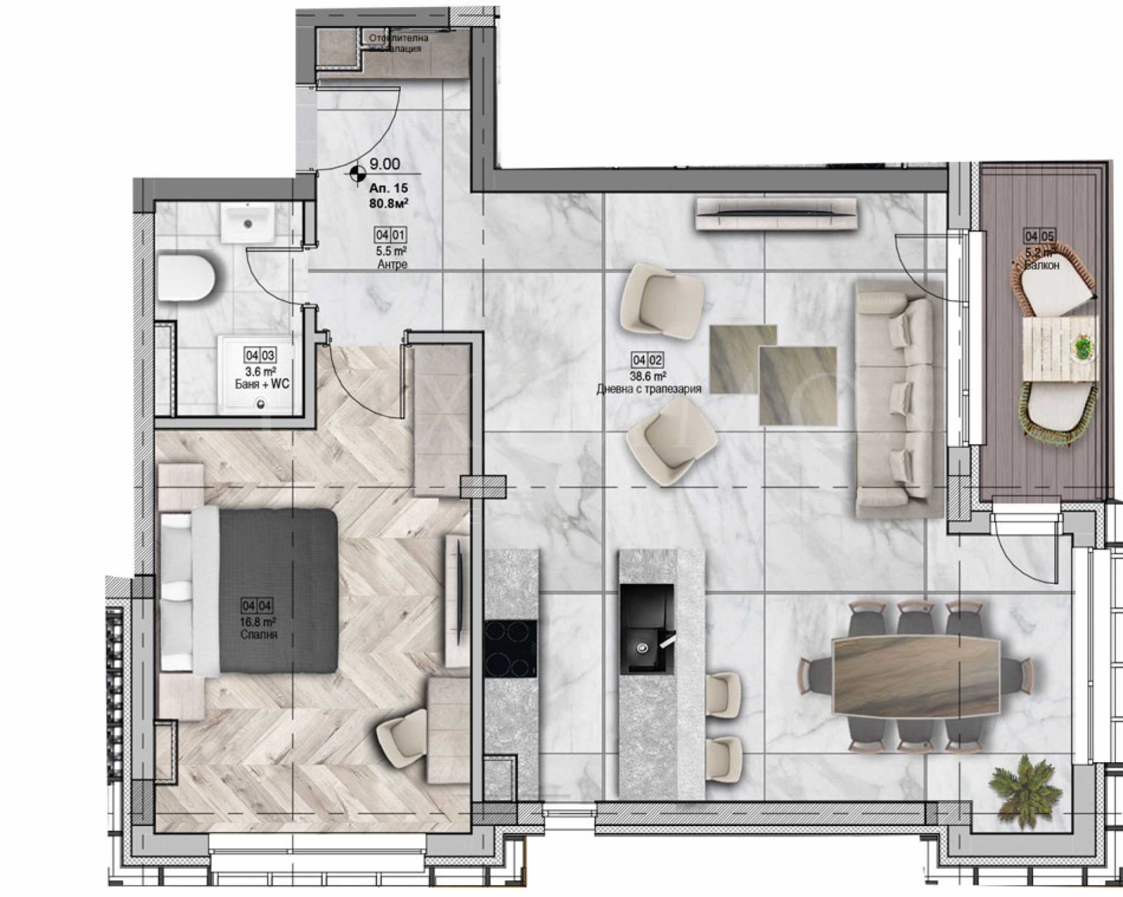 Апартаментът се намира на 4-ти етаж от 6, със западно изложение и има обща площ 91.08 кв.м, застроената площ е 81.10 кв.м. Разпределението включва антре, баня/тоалетна, една спалня, дневна с кухня и трапезария, тераса.