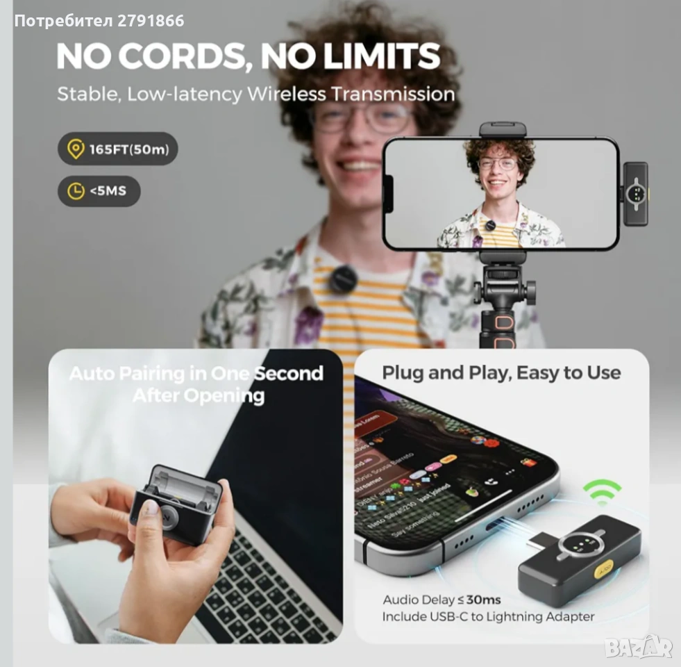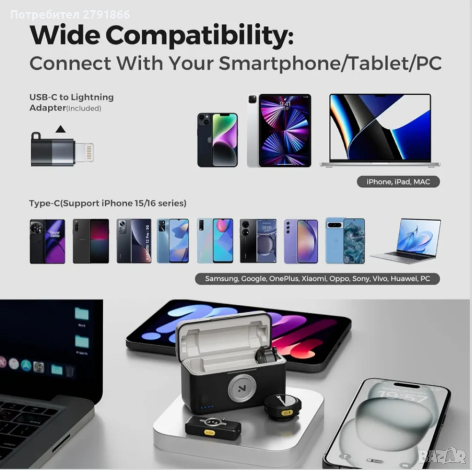 - ШИРОКА СЪВМЕСТИМОСТ С УСТРОЙСТВА Независимо дали става въпрос за смартфон, DSLR фотоапарат, лаптоп или други аудио устройства, този безжичен микрофон е съвместим с широка гама от устройства и осигурява безпроблемна връзка за различни приложения.