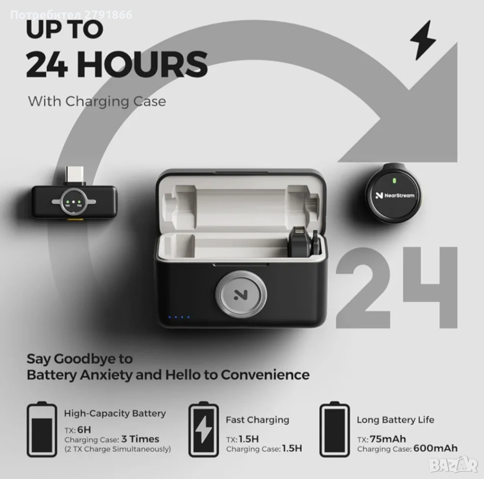 - 24-часов живот на батерията Насладете се на непрекъснат аудио запис с впечатляващ 24-часов живот на батерията, което позволява на вашия безжичен микрофон да издържи дълги сесии, събития или ротации без често зареждане.