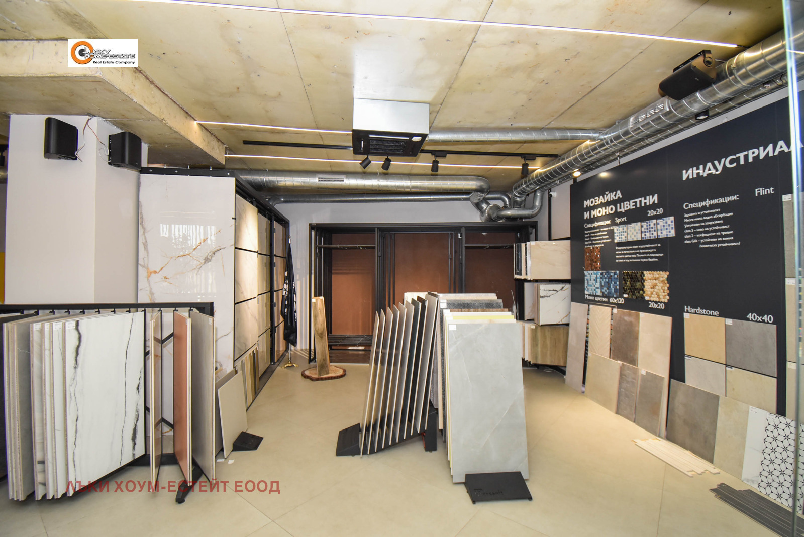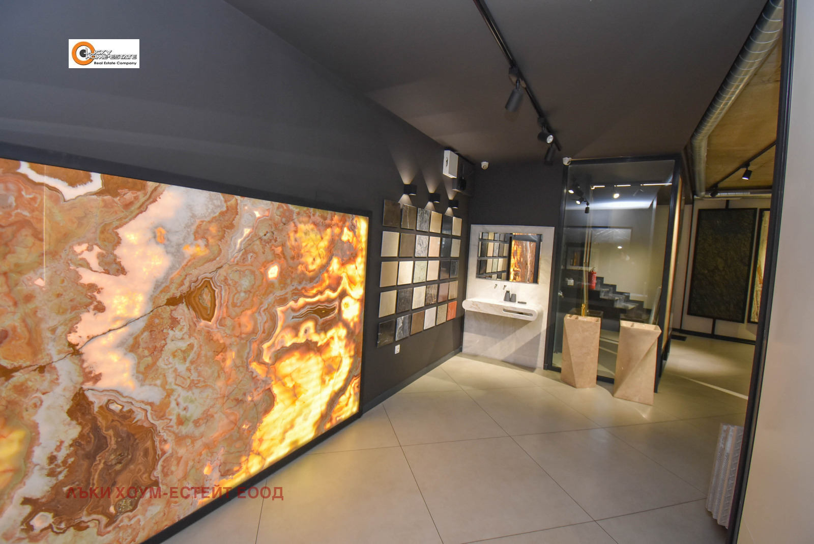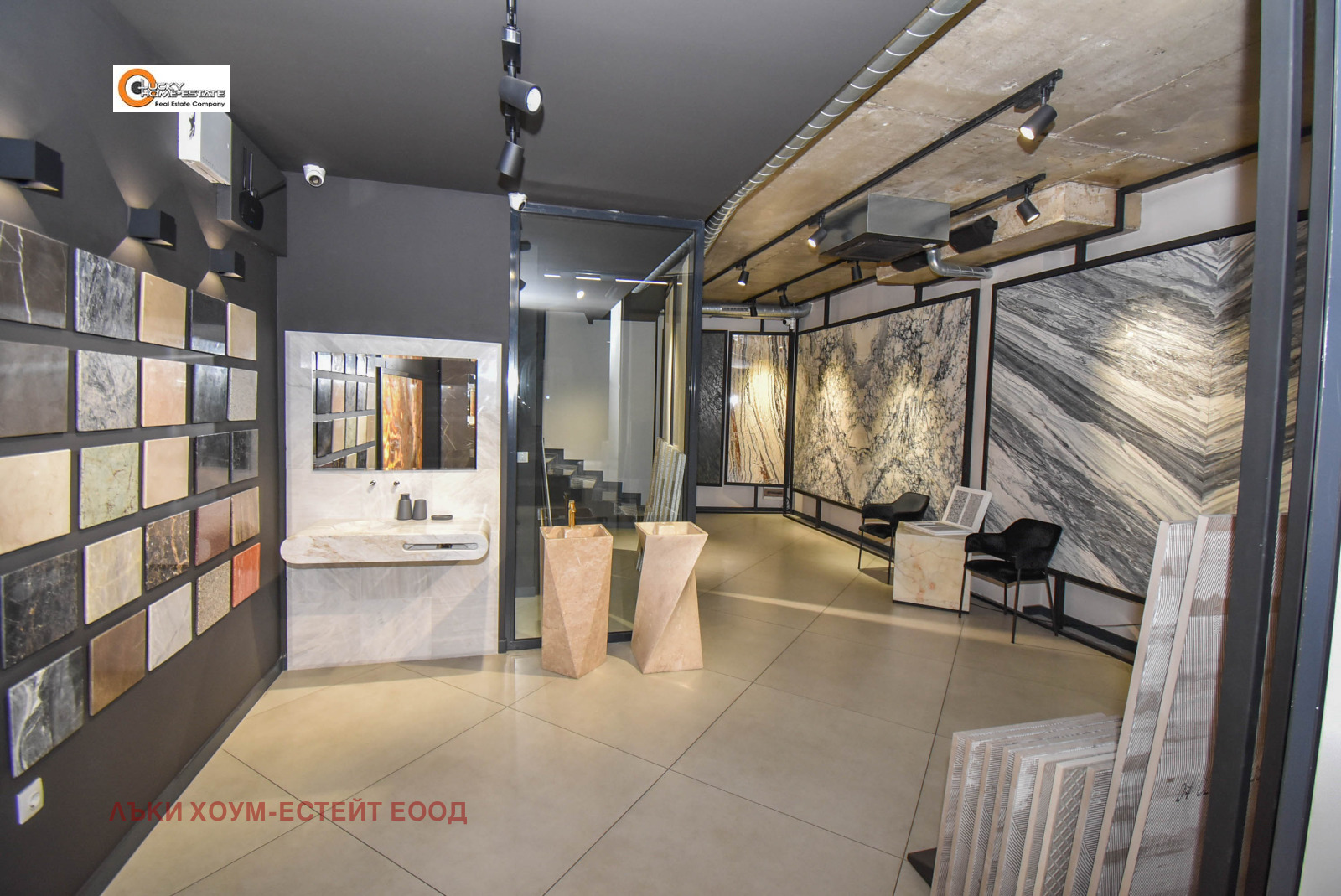 Лъки Хоум-Естейт предлага ЕКСКЛУЗИВНО за продажба луксозно завършен и напълно оборудван търговски обект, функциониращ като шоурум за санитария и естествен камък, разположен на две нива в модерна търговско-административна сграда.