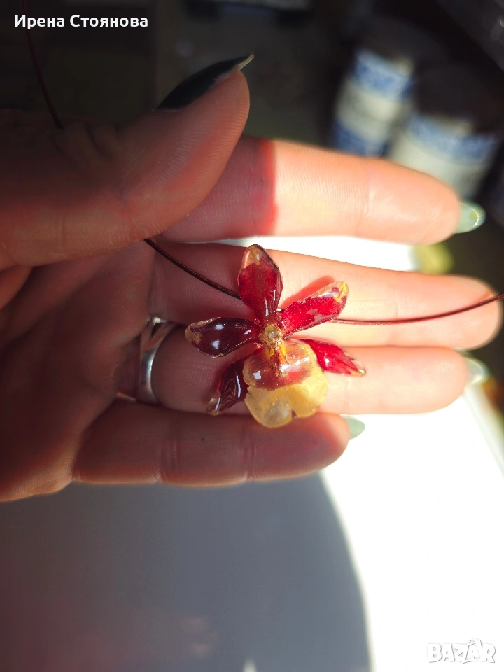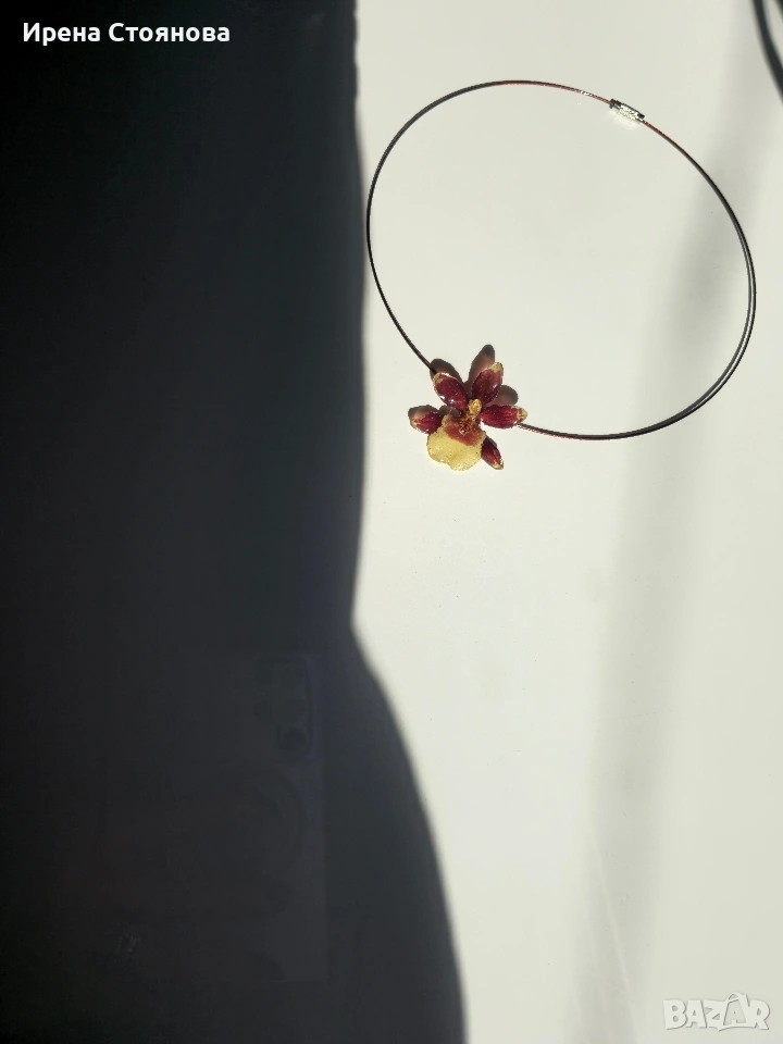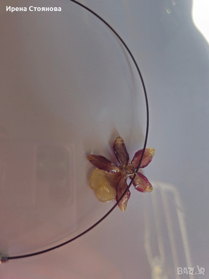Колие с естествен цвят на мини орхидея. Цветче с размери 3,5/3,5 см. Гердан с винтова закопчалка и диаметър 14 см. Внимателно изсушени и запечатани в няколко слоя епоксидна смола, така че да им се придаде здравина, запазване на формата и цвета. Всяко цвете е различно и неповторимо, което го прави единствено и уникално. Цена 18 €.
