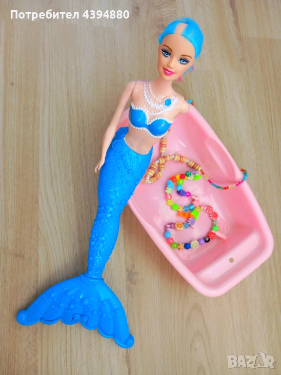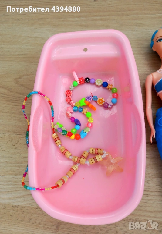 Красива кукла Русалка с вана за къпане и нови детски бижута от цветни мъниста. Комплекта включва нови две гривни и колие.