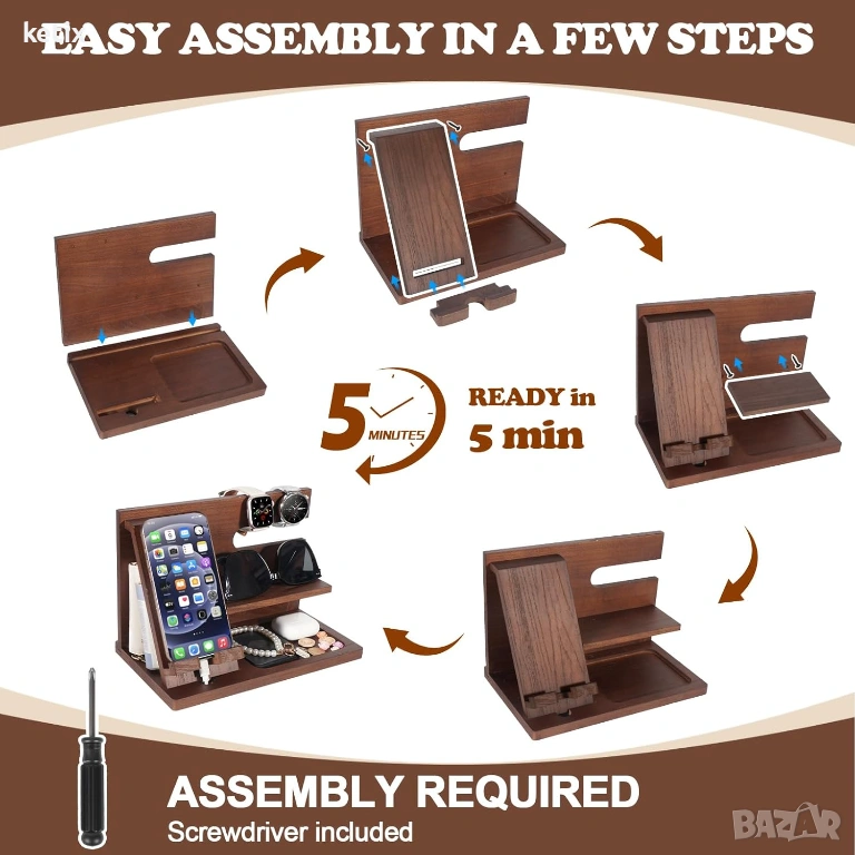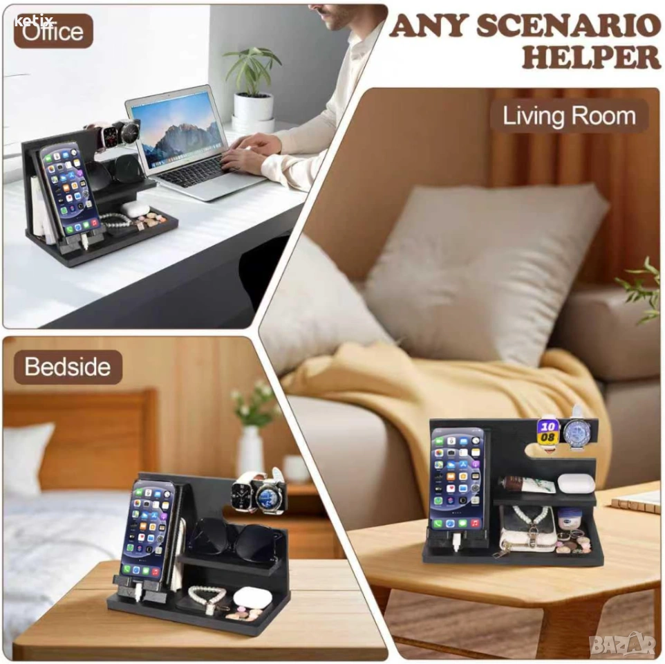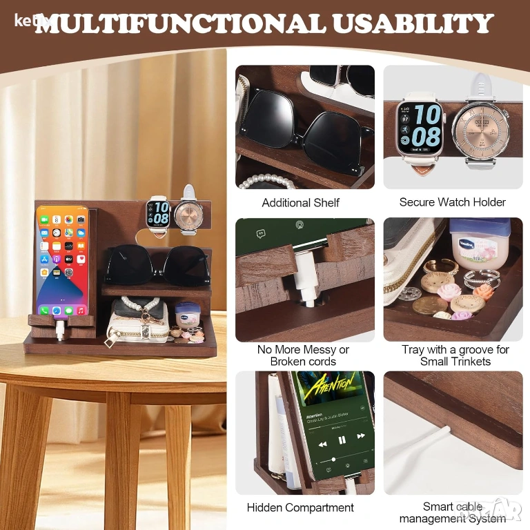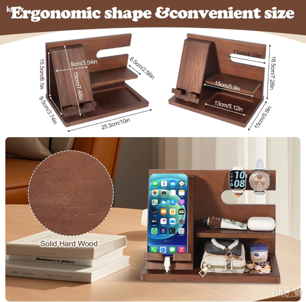 Дървената докинг станция за телефон е лесна за сглобяване (предоставени са ръководство за сглобяване и винтове за безпроблемна настройка) и е съвместима с всички видове смартфони; Поставката има и отделения за портфейли, документи, очила, часовници, фитнес тракери, гривни, ключове, канцеларски материали и др.