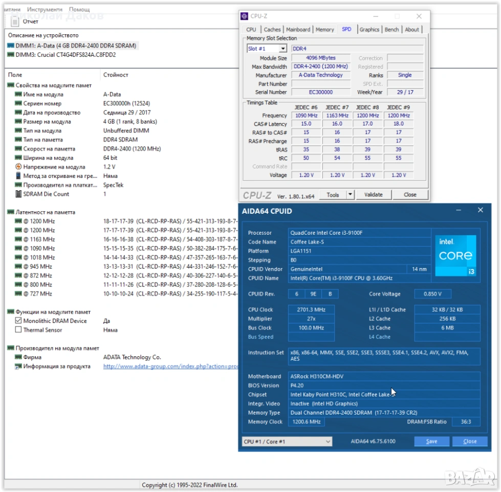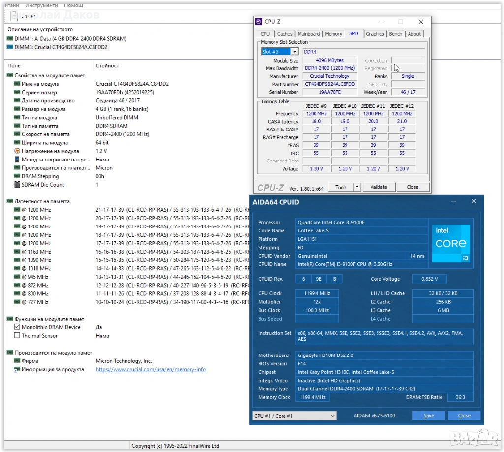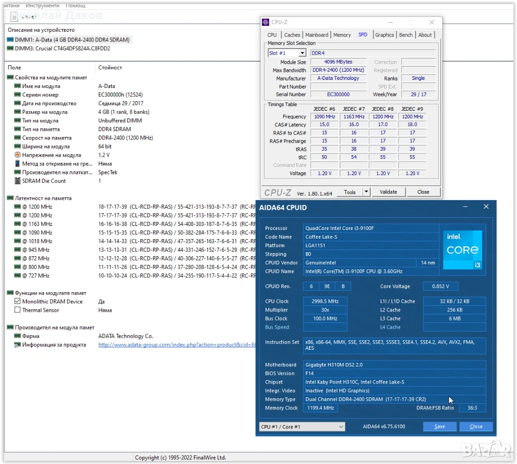 5.Рам - два модула по 4 Гб ДДР4 2400 Мхз, единия Crucial, другия A-Data, всичко за тях се вижда на скрийновете.