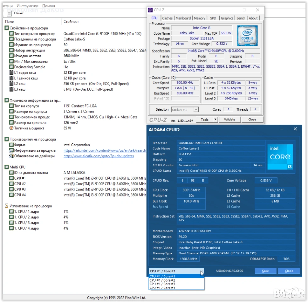 4.Процесор: I3-9100f, четири ядра - четири нишки, с макс на всички ядра 4 Гхз, и турбо бууст до 4.4, 6 Мб Л3 кеш, охалждан без абсолютно никакви проблеми от настоящия си боксов куулър. Доста прилична производителност, за почти всякакви игри от минимални до хай настройки става.