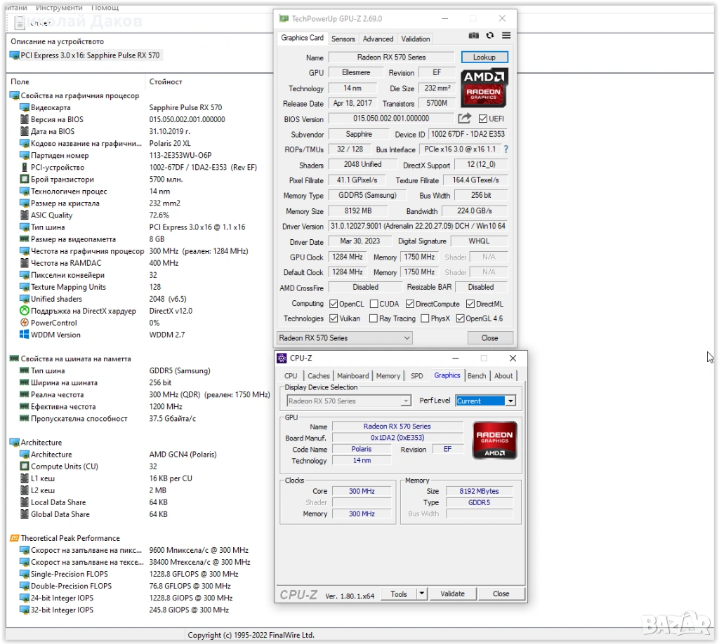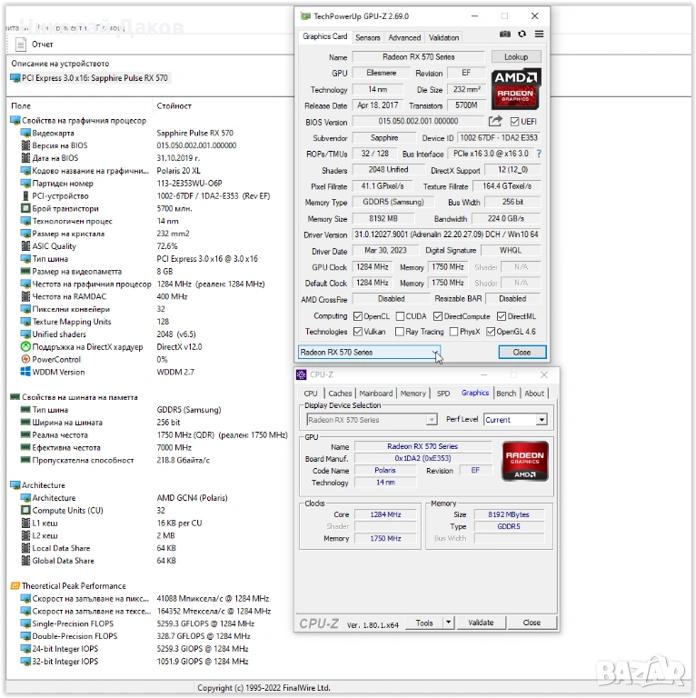 6.Видеокарта: Sapphire Pulse RX570 8 Gb DDR5 256 bit, тук няма какво толкова да се коментира и описва, има достатъчно инфо в нета, два дисплей-порта и два HDMI-извода, Профилактирана, обслужена, в най-зверските тестове на затворена кутия не качва над 70 градуса.