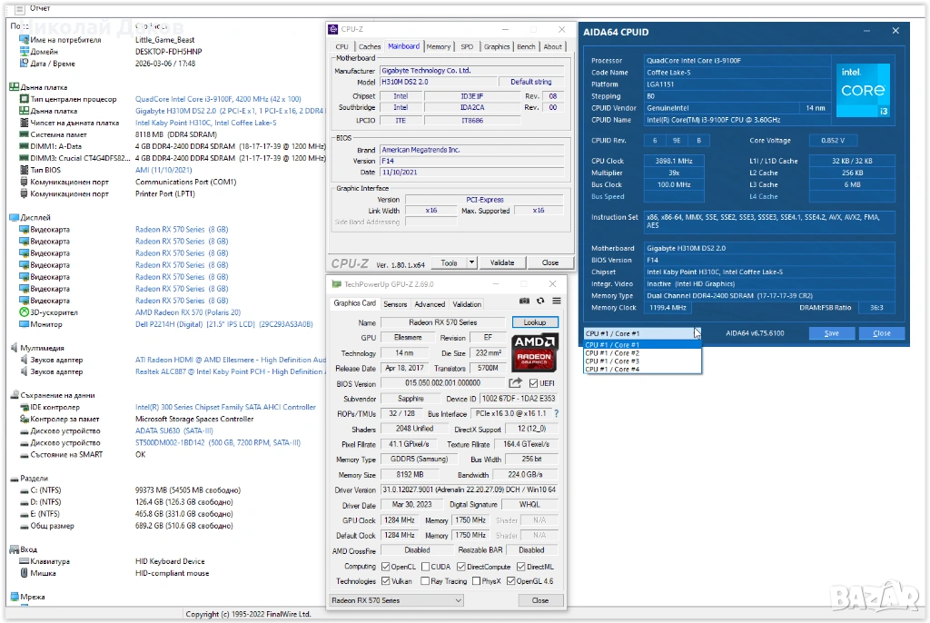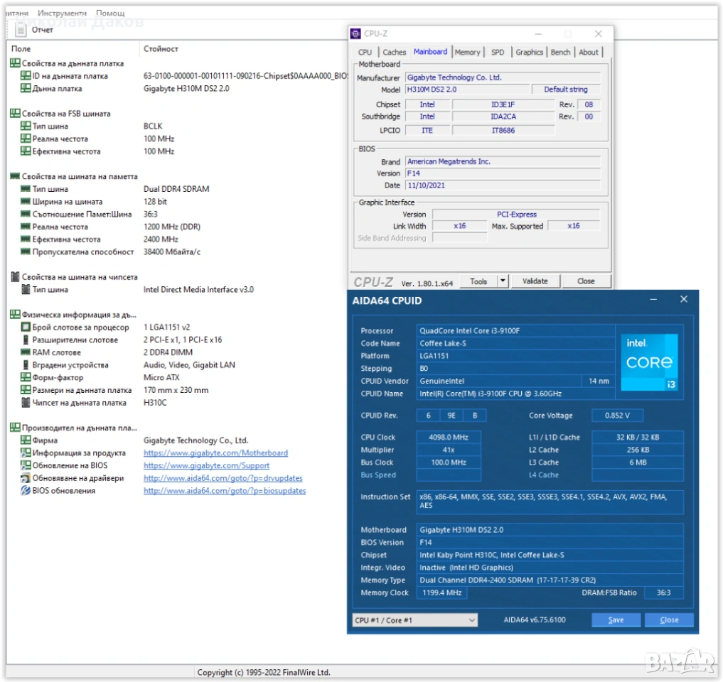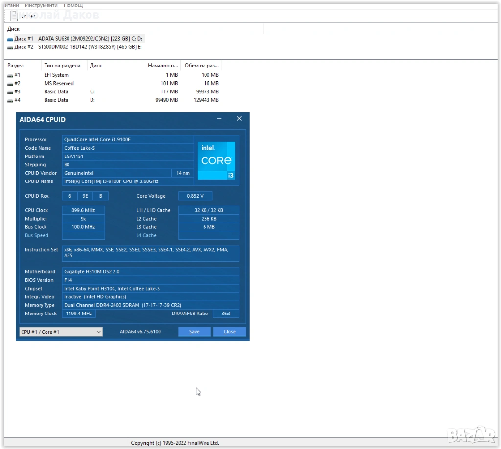 3.Дънна платка: Gigabyte H310M-DS2 rev. 2.0. Нищо екзотично, поддържа 8-мо и 9-то поколение Интел без изключения, с I5/I7 процесор поддържа и ХМР на 2666, работи без забележки, с настоящия проц държи рамта на 2400, и такава е монтирана. Специално да се види, че и вграденото видео работи, правих скрийн и с I3-8100, но някъде го потурчих. При сериозно желание мога да направя скрийн, да се види, че и вграденото видео работи.