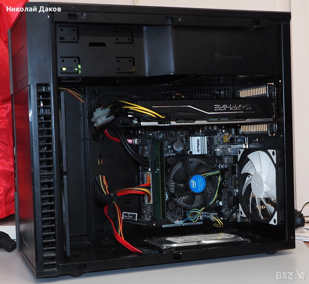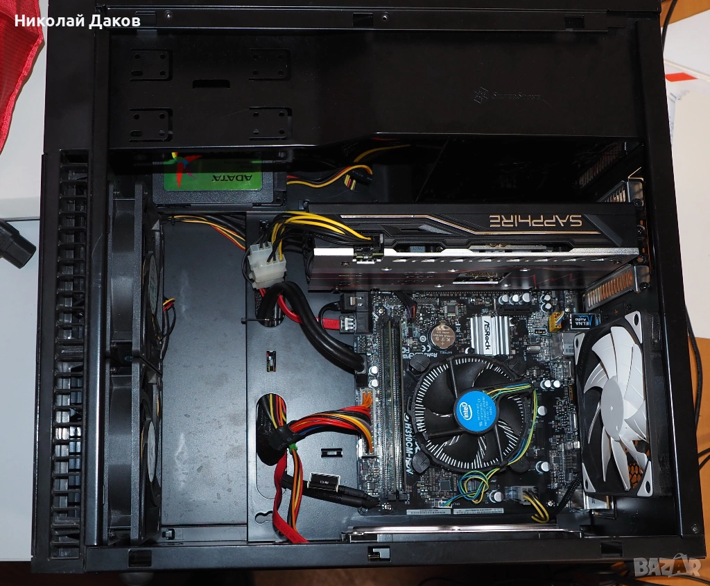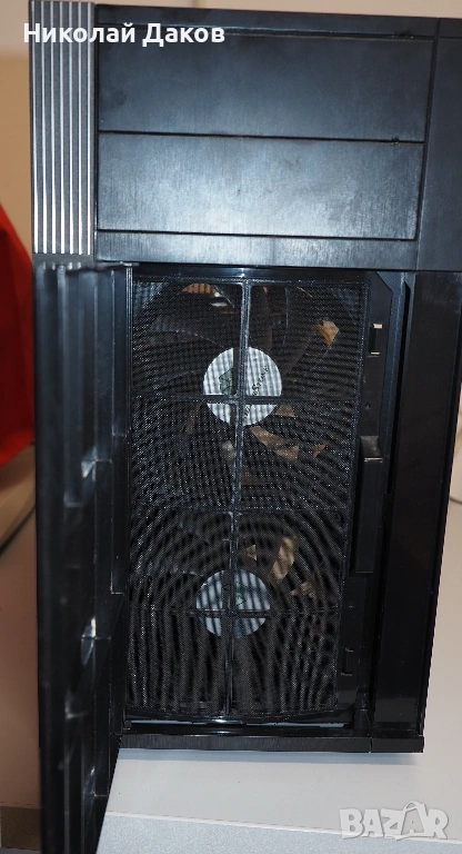 1.Кутия: мАТХ "Silversstone", с малко странен дизайн - вижда се на снимките - всичко е надолу с главата, но е с добра широчина и много добър въздухопоток - два вкарващи вента 120 мм(оригинални "Silversstone") и един изкарващ пак 120 мм с четири бели светодиода, не му помня марката. Две фронт юсб 3.0 и симпатични светещи в синьо диоди. По кутията има нормални следи от употреба, като има тънки драскотини по единия страничен капак, не са силно видими, но се забелязват. При желание - снимам и изпращам снимки.