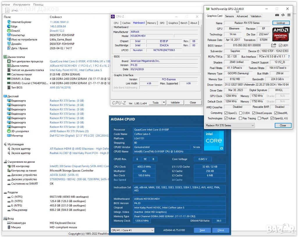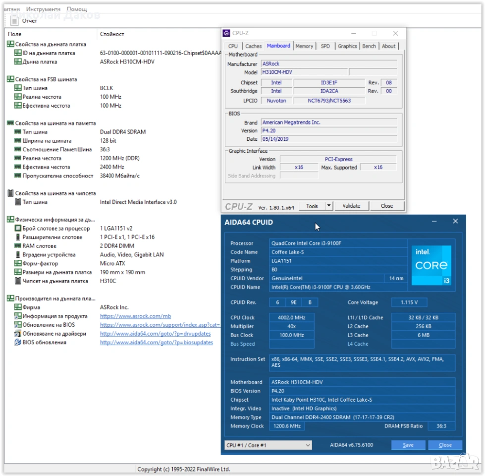 3.Дънна платка: Asrock h310cm-hdv, nищо екзотично, поддържа 8-мо и 9-то поколение Интел без изключения, с I5/I7 процесор поддържа и ХМР на 2666, работи без забележки, с настоящия проц държи рамта на 2400, и такава е монтирана. Специално да се види, че и вграденото видео работи, правих скрийн и с I3-8100, но някъде го потурчих. При сериозно желание мога да направя скрийн, да се види, че и вграденото видео работи.