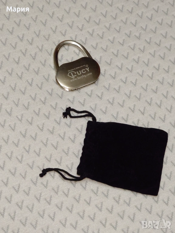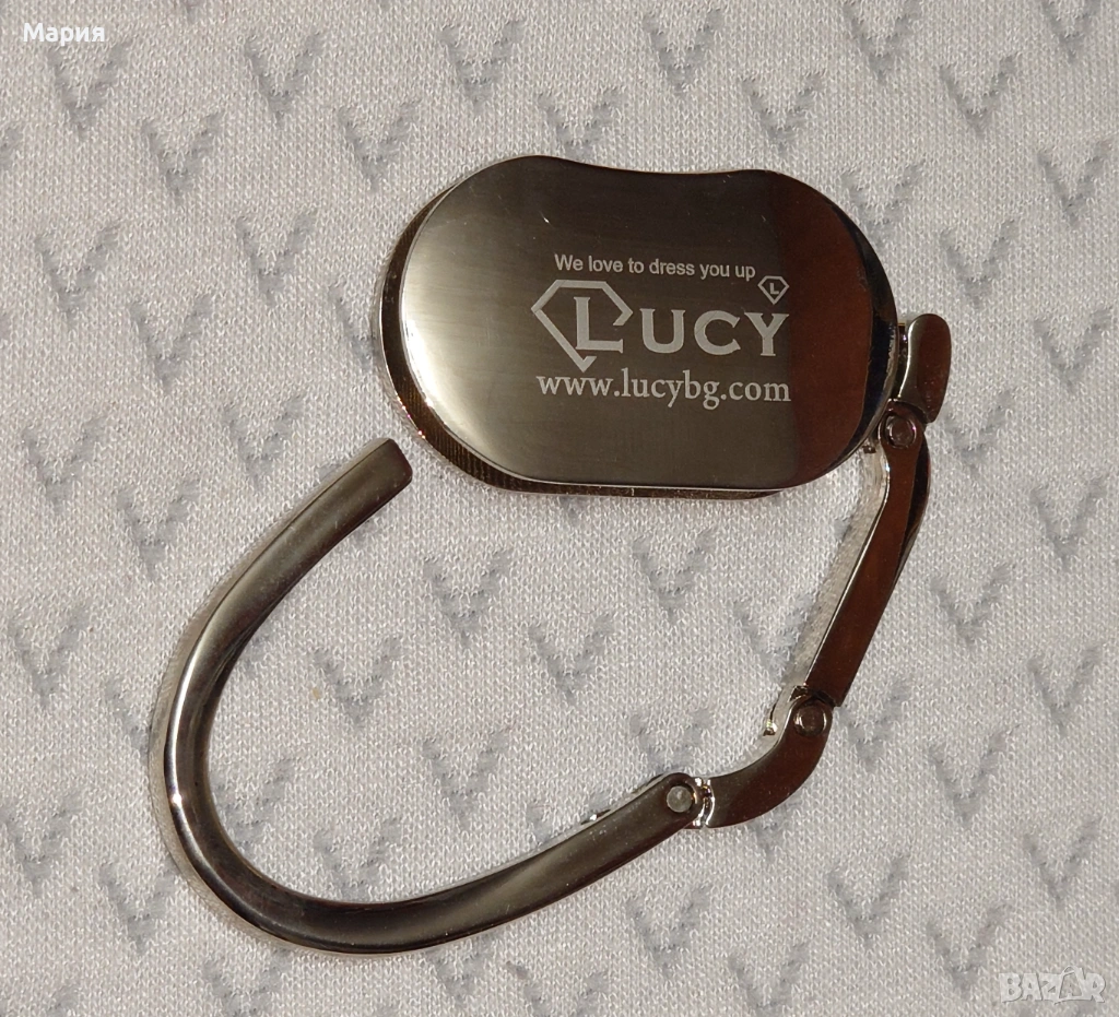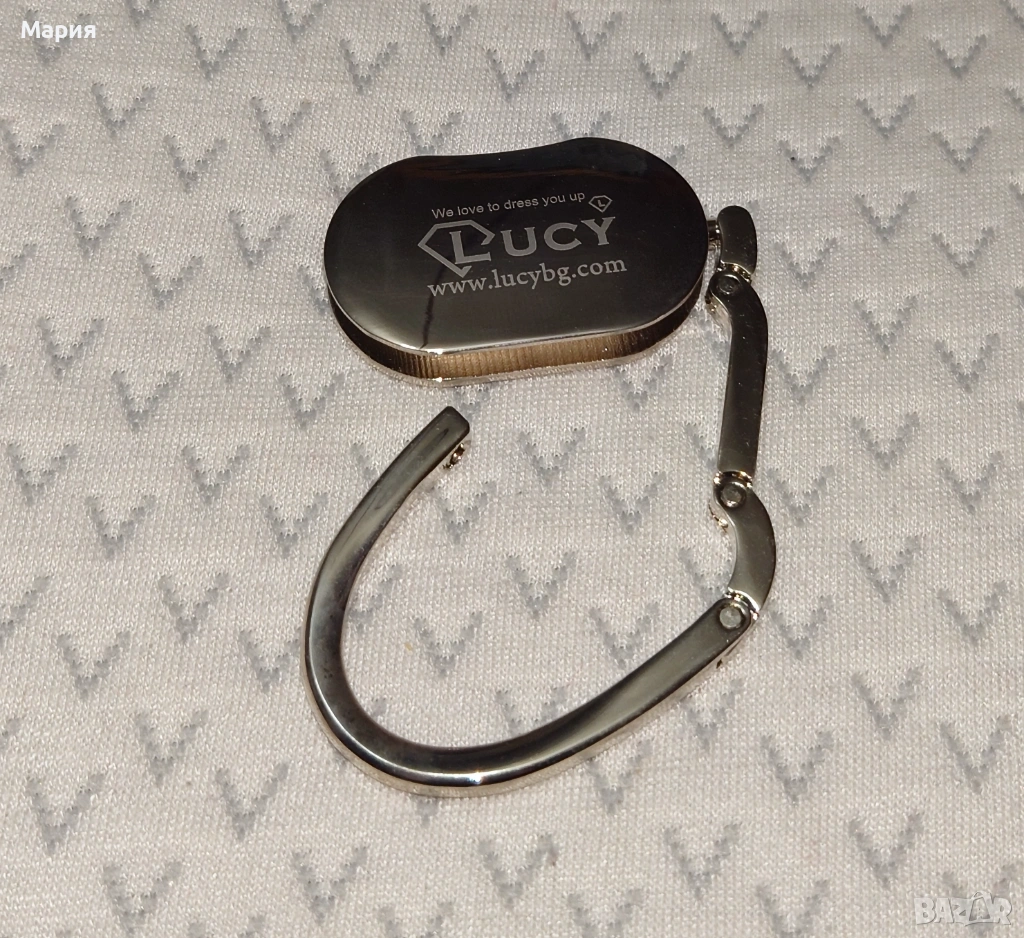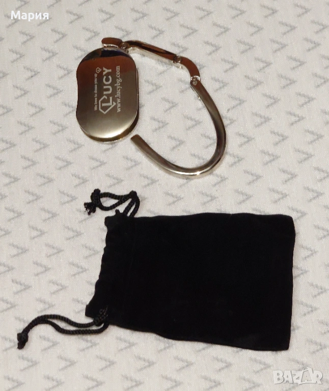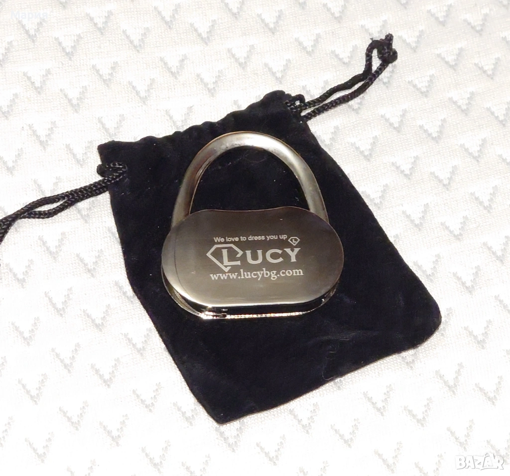 Метален държач за дамска чанта или раница на Lucy Fashion. Има и велурено калъфче. Държачът не е използван.