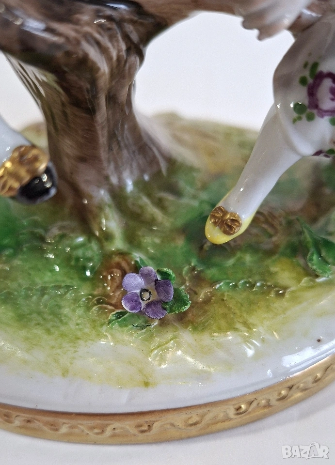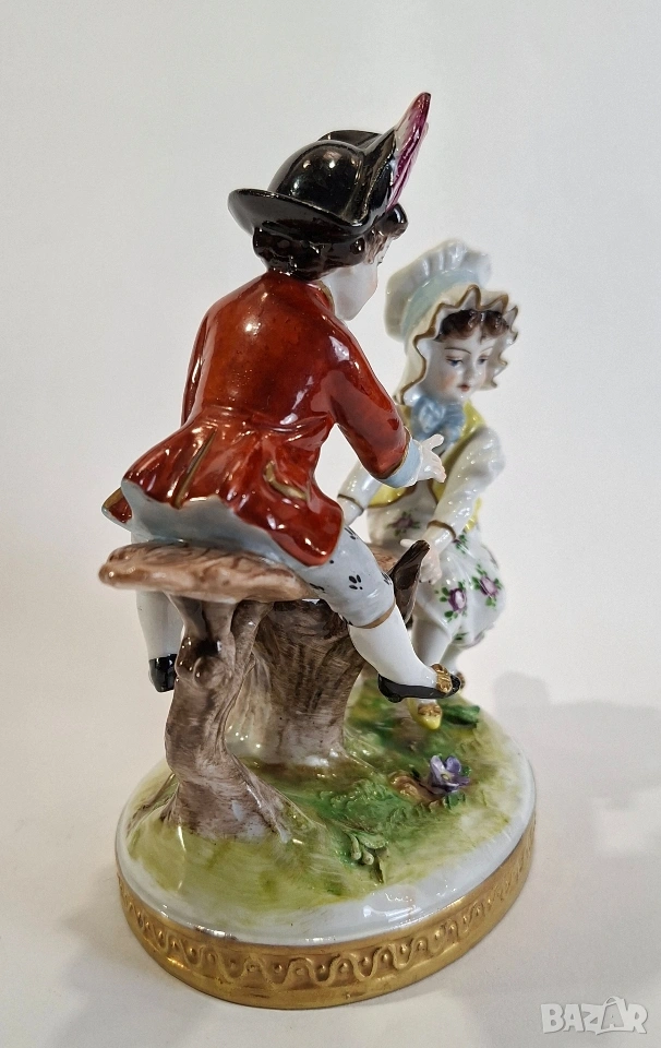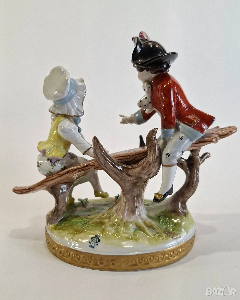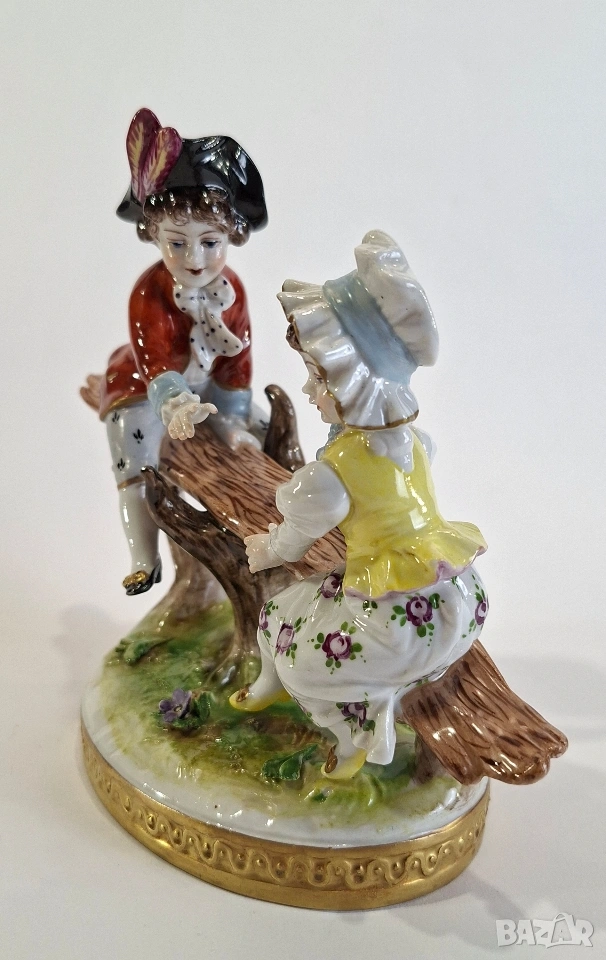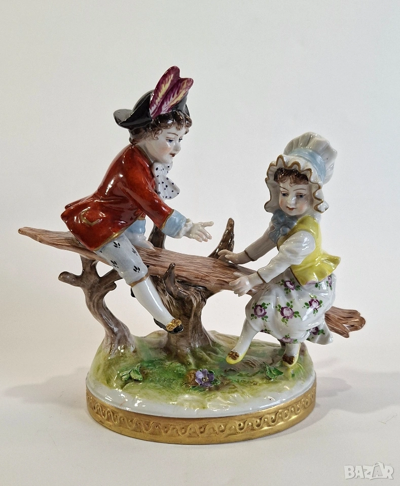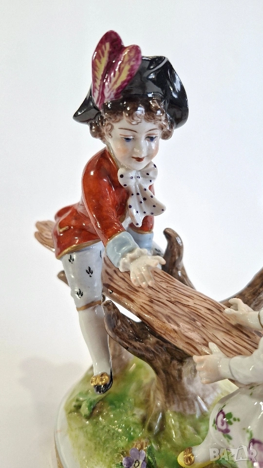 Порцеланова фигурка, изобразяваща момче и момиче, играещи на люлка. Композицията е изработена с фин детайл и нежно ръчно оцветяване, характерни за изделията на Volkstedt. Ярките цветове и изразителните лица придават особено живо и романтично излъчване.