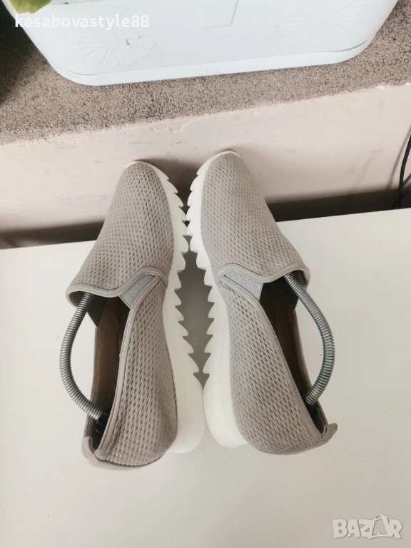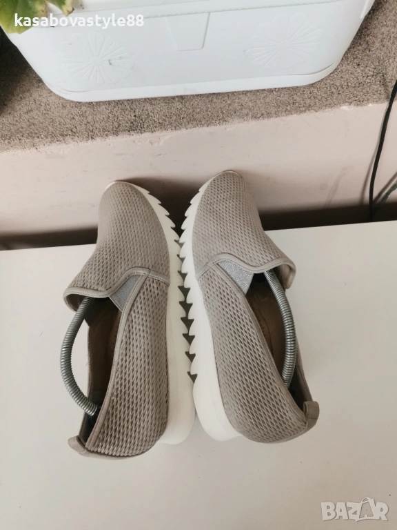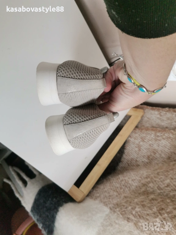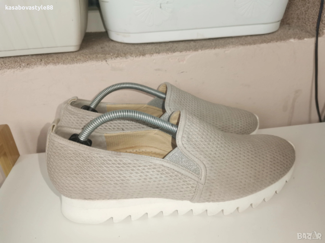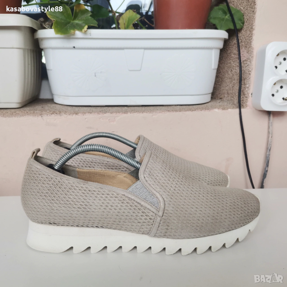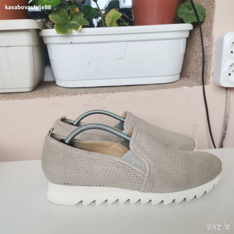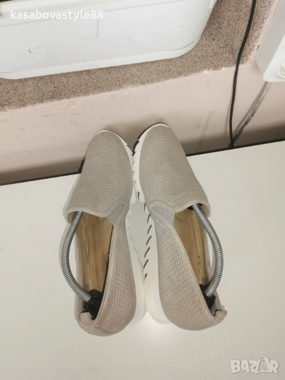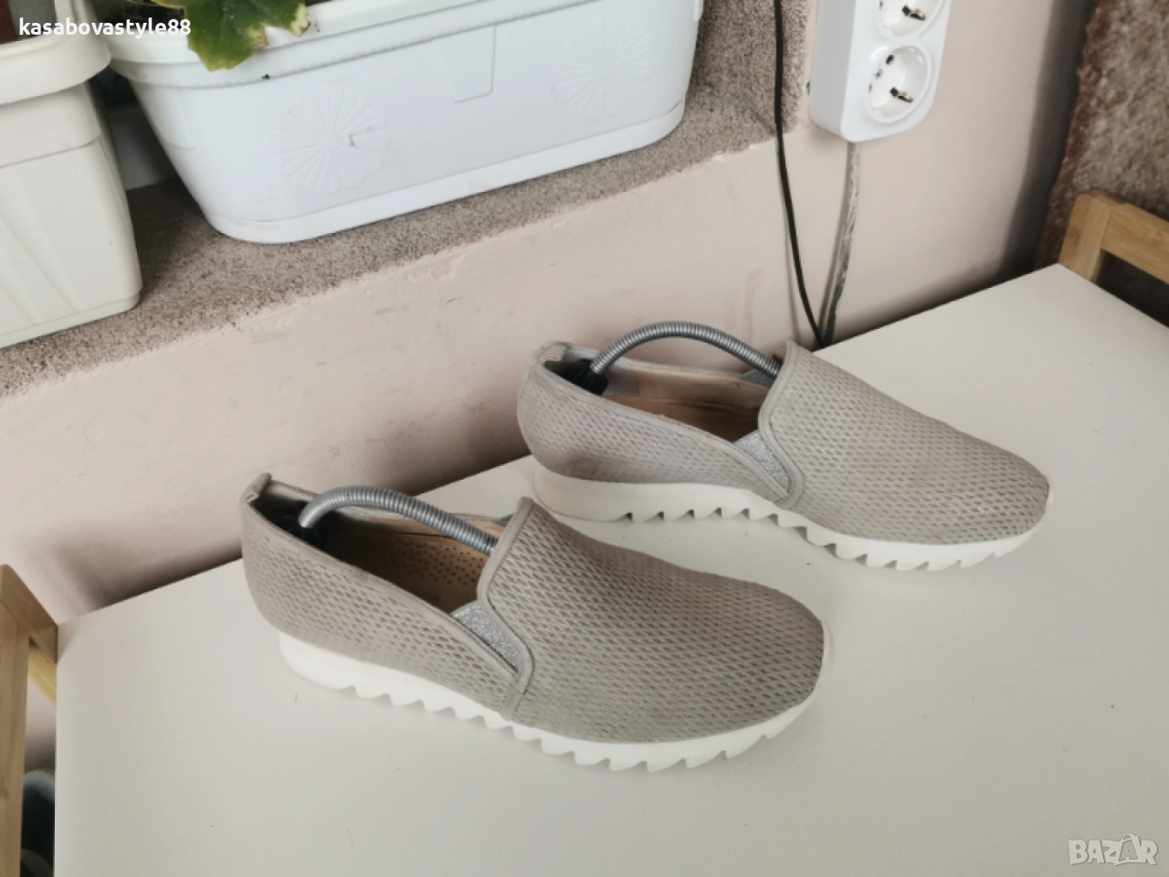 Обувките са в топ състояние!! Изработени от висококачествена естествена кожа в бежов цвят. Те са леки и много комфортни, перфектен модел както за ежедневието така и за официални поводи. От 2 те страни са с ластички. Дължина на стелка 24.5см.Цялостна височина отзад 8.5см.Ходило 2.5см.