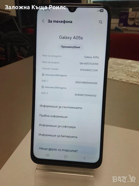 Samsung A05s. Телефонът е използван и има следи от употреба по корпуса, които се виждат на снимките. Работи нормално без технически проблеми.