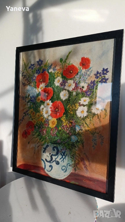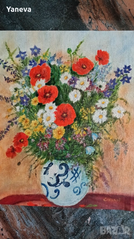 Картина "Полски цветя" , маслени бои върху платно в рамка , подписана Стоилов. Размер 53 / 43 см. Цена 60 €.