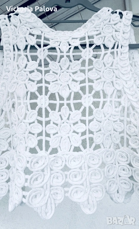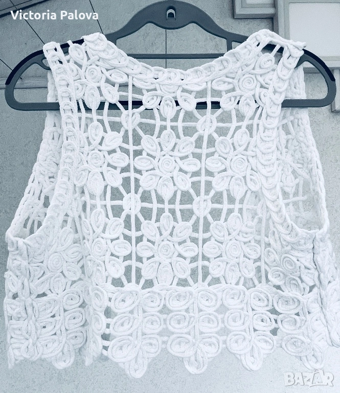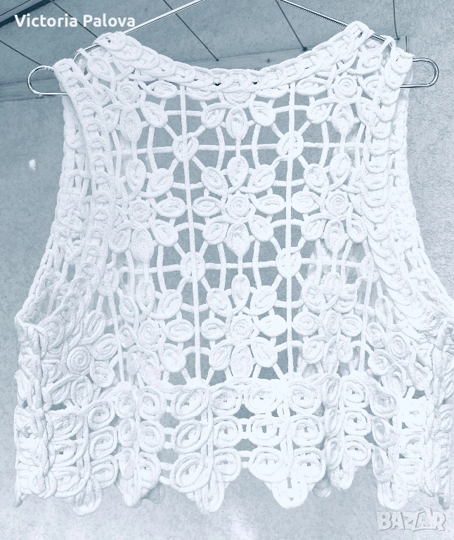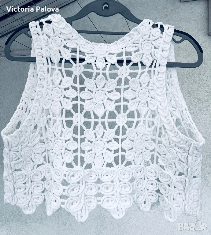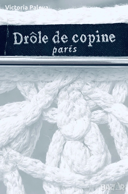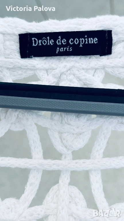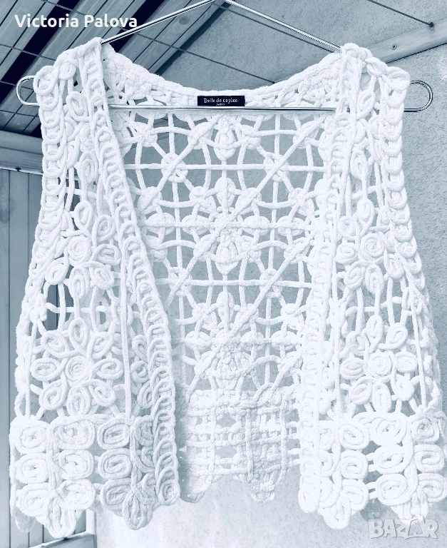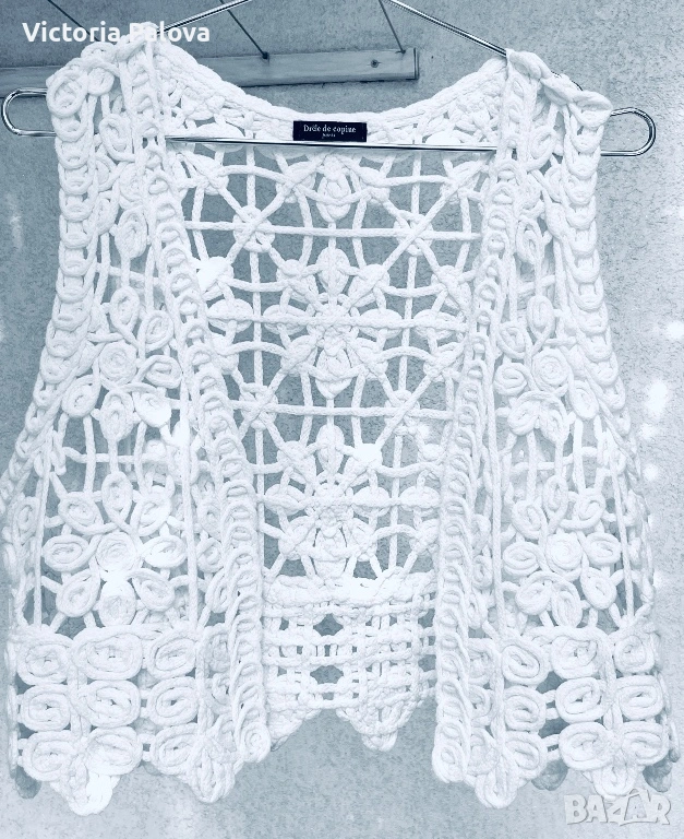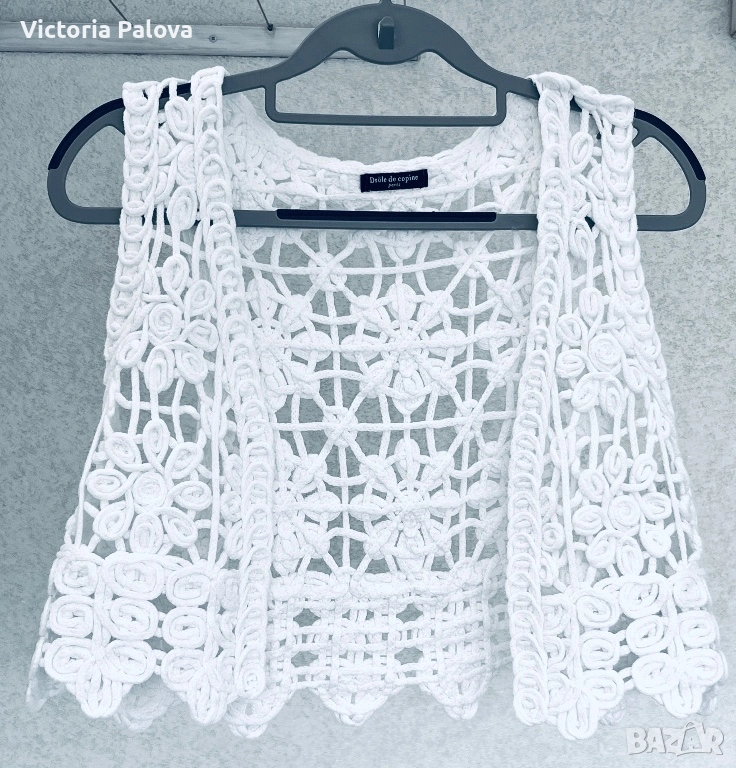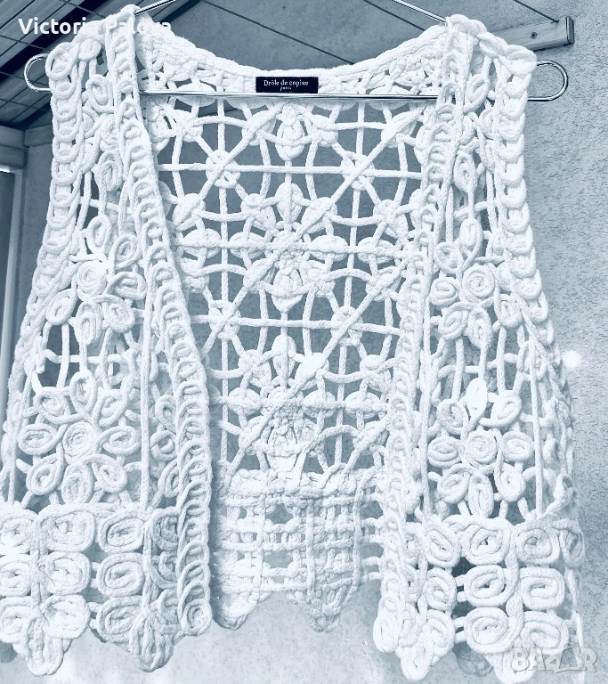 Този изящен бял crochet елек от френската марка Drôle de Copine е ръчно изплетен с фини флорални мотиви и ажурни детайли. Той е като лека прегръдка от пролетен бриз – прозрачен, ефирен и изключително женствен. Изработен от 95% памук и 5% полиестер, осигурява комфорт и издръжливост, без да жертва стила. Без ръкави, с отворена предна част и декоративни розетки по краищата, този елек е перфектният акцент за всяка рокля, блуза или топ – от casual дневни визии до романтични вечерни излизания. В отлично състояние, с оригинален етикет, той добавя нотка на vintage елегантност към гардероба. ГО - 44см приблизително, дължина - 45см.