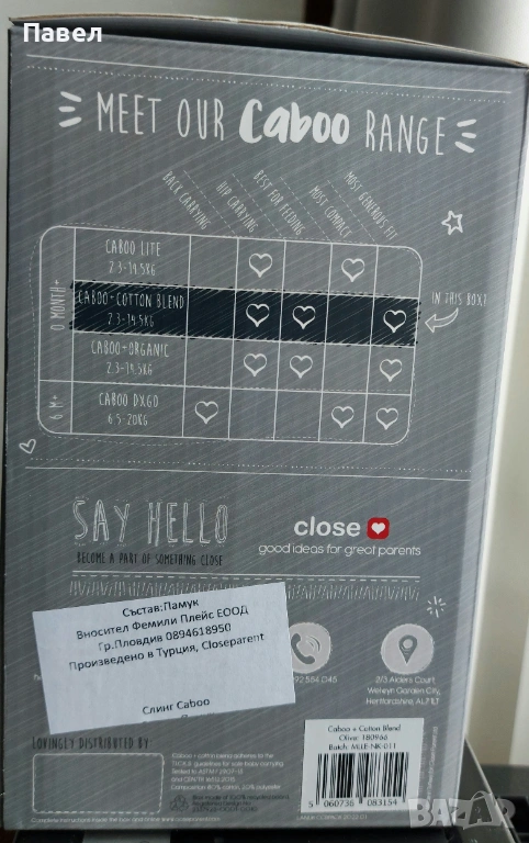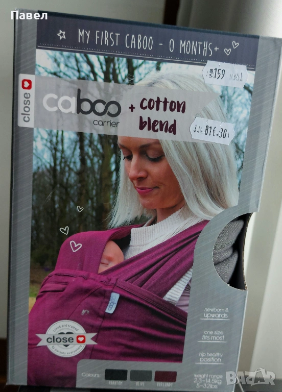 Продавам слинг Caboo в състояние като за чисто ново, използвано 2-3 пъти колкото да тестваме малкия дали ще стои. Става за деца между 2.3кг и 14.5кг.