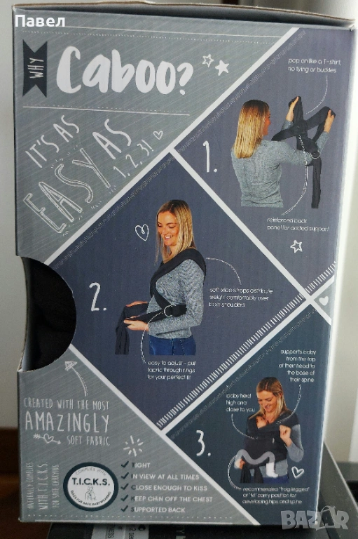 *Напълно регулируем,слингът Caboo e лесен за употреба и приляга еднакво добре на всяка фигура,което го прави фаворит и на бащите по цял свят.