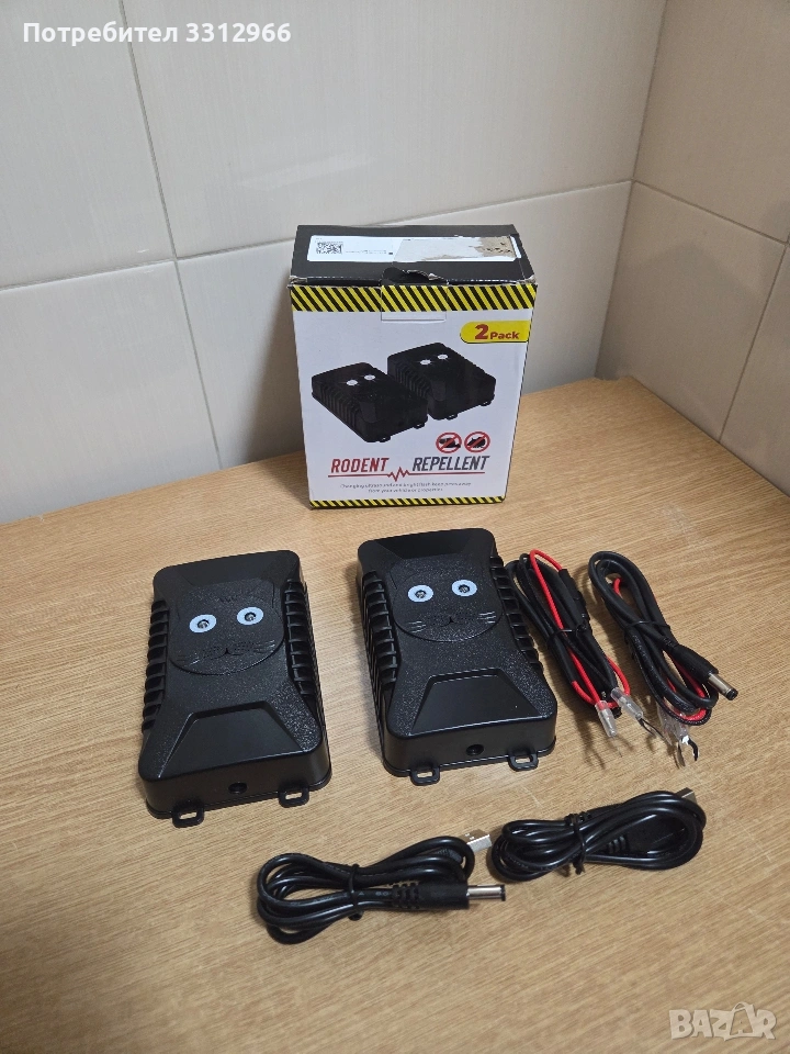 2 броя ултразвукови устройства против гризачи (мишки, плъхове), предназначени за използване под капака на автомобил или в други малки пространства. Използват ултрависокочестотен шум за възпиране на гризачи. Редуващите се мигащи светлини могат да стимулират фотофобния инстинкт на животните. Предлагат се в опаковка от два броя, както е посочено на кутията ("2 Pack"). Захранват се от 5 до 12V USB.