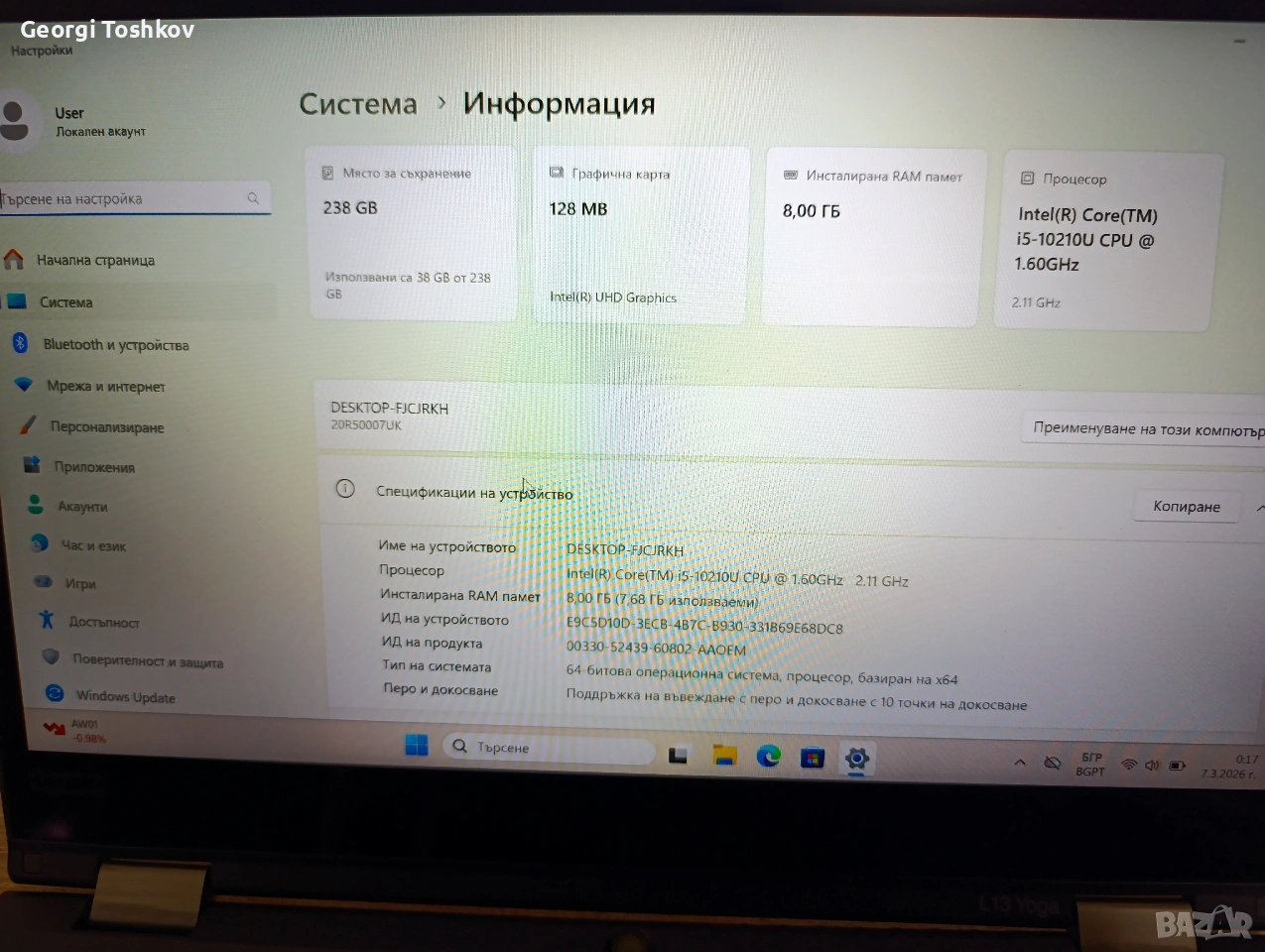 Хубав и надежден L13 yoga, процесор i5-10th gen, 8gb ram, 256gb nvme. 13.3' FHD touchscreen dispaly. Разполага с две камери, Bluetooth, пръстов отпечатък. 2 usb port, 2 usb type-c, hdmi, micro sd card port и други. Лаптопа е много бърз, инсталиран и лицензиран windows 11 pro. Подходящ за работа, обучение, автодиагностика и други. Тежи едва 1.40kg, което го прави много удобен и за работа навън. Бизнес клас, без скрити дефекти. Почистен и готов за употреба има и писалка.