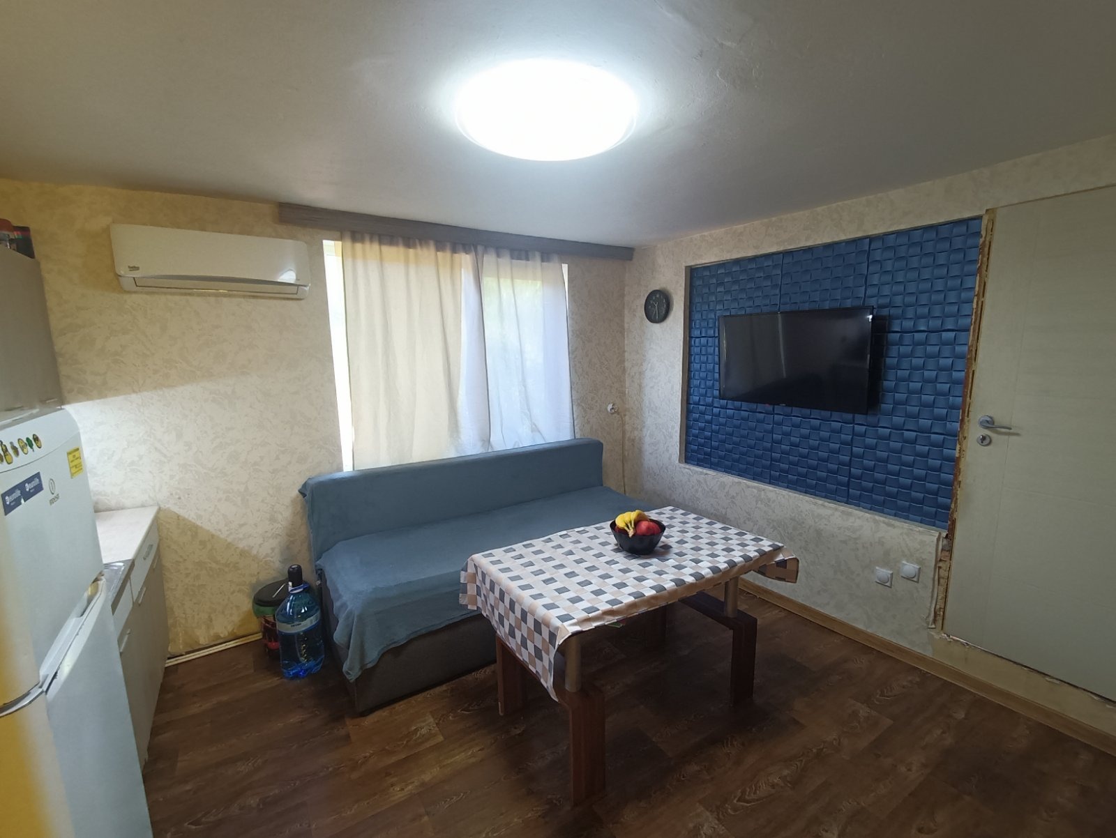 1-ви етаж разполага с антре - 6кв.м., трапезария- -9 кв.м., кухня - 9кв.м., голяма спалня - 16кв.м., дневна /хол/ - 26кв.м., баня с WC - 6кв.м., килер - 6кв.м. и вътрешни стълби към 2-ри етаж. Сменени ВиК и Ел. инсталация, изградена тръбна инсталация за отопление, без печка и радиатори. Етажа е с вътрешна и външна топлоизолация и PVC дограма.