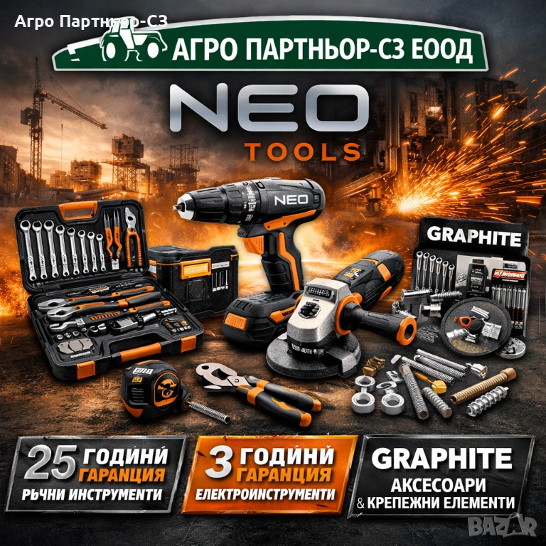 Фирма Агро Партньор-СЗ ЕООД има удоволствието да Ви предложи професионални ръчни и електрически инструменти с марката NEO TOOLS, както и богато разнообразие от аксесоари GRAPHITE и крепежни елементи, подходящи за магазини за инструменти, строителни борси и складове.