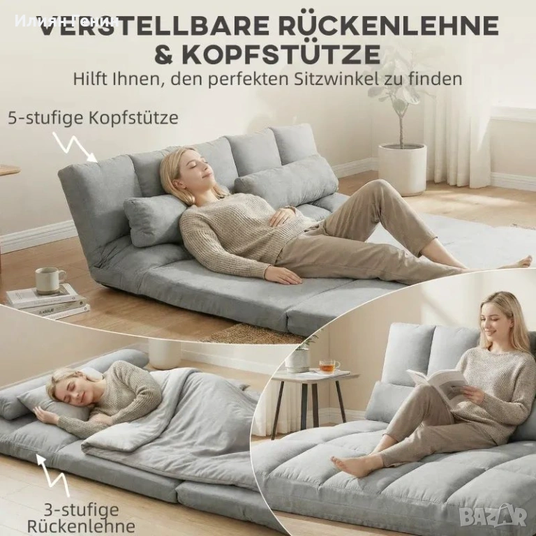 Двойна функция: Този многофункционален подов диван предлага две приложения. Облегалката може да се регулира гъвкаво – като удобен диван или като удобен разтегателен диван за часове за релакс.