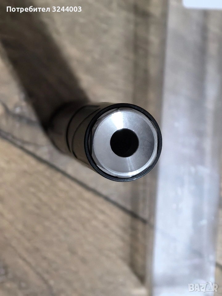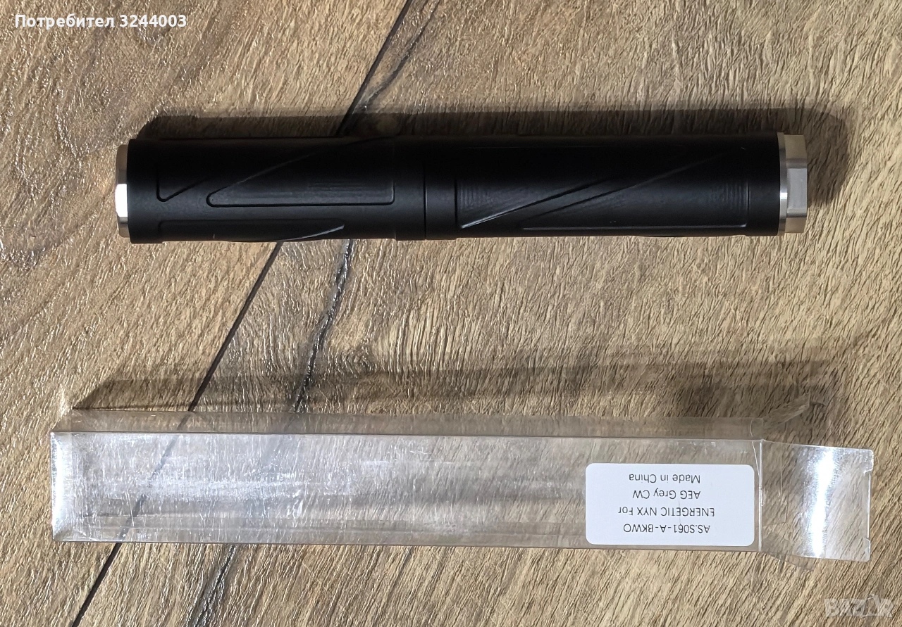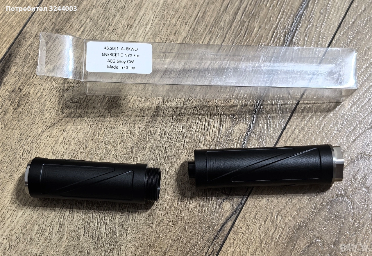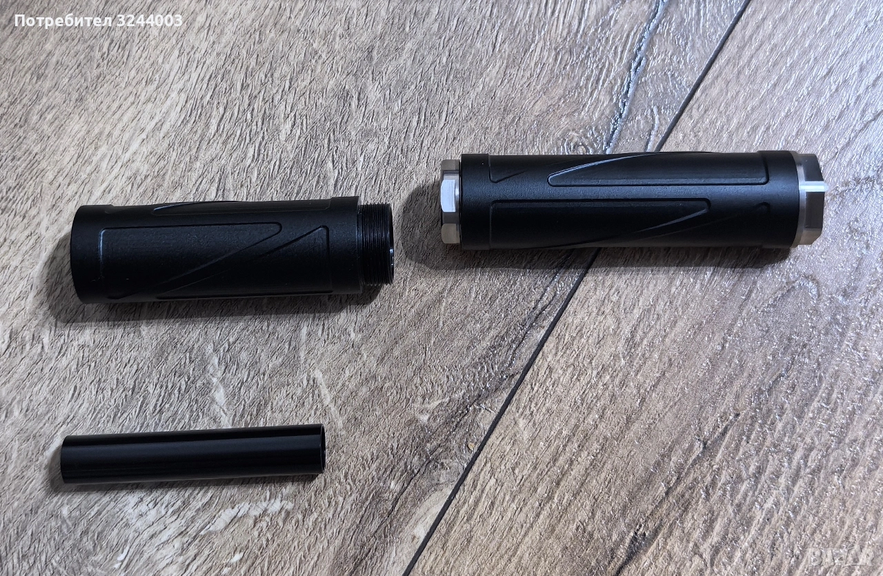 Заглушителя е модуларен и става на три различни дължини, като вътре има и стабилизатор за вътрешна цев ако решите да го ползвате като удължение за външна цев. Много е красив и е направен от здрав алуминий, като капаците са от стомана Цената му е 20€