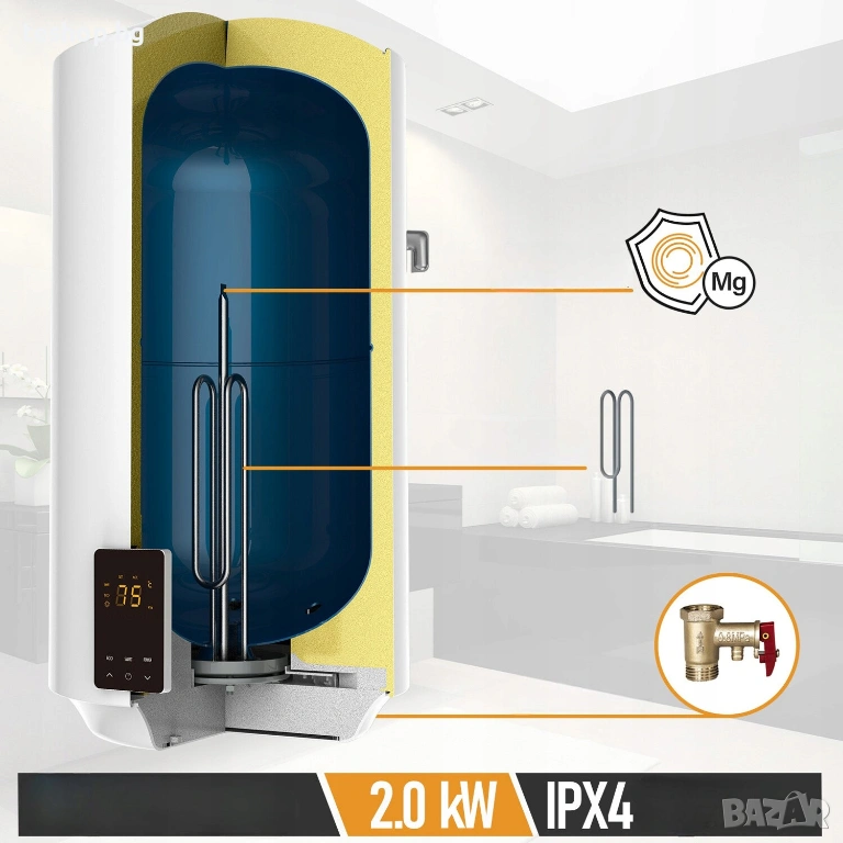 Има двуслоен, емайлиран вътрешен резервоар с покритие против котлен камък и магнезиев анод (5 пъти по-дълъг живот)