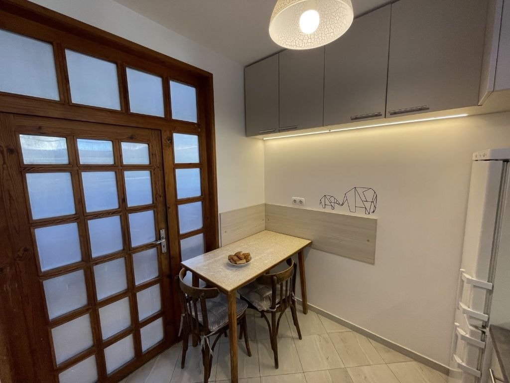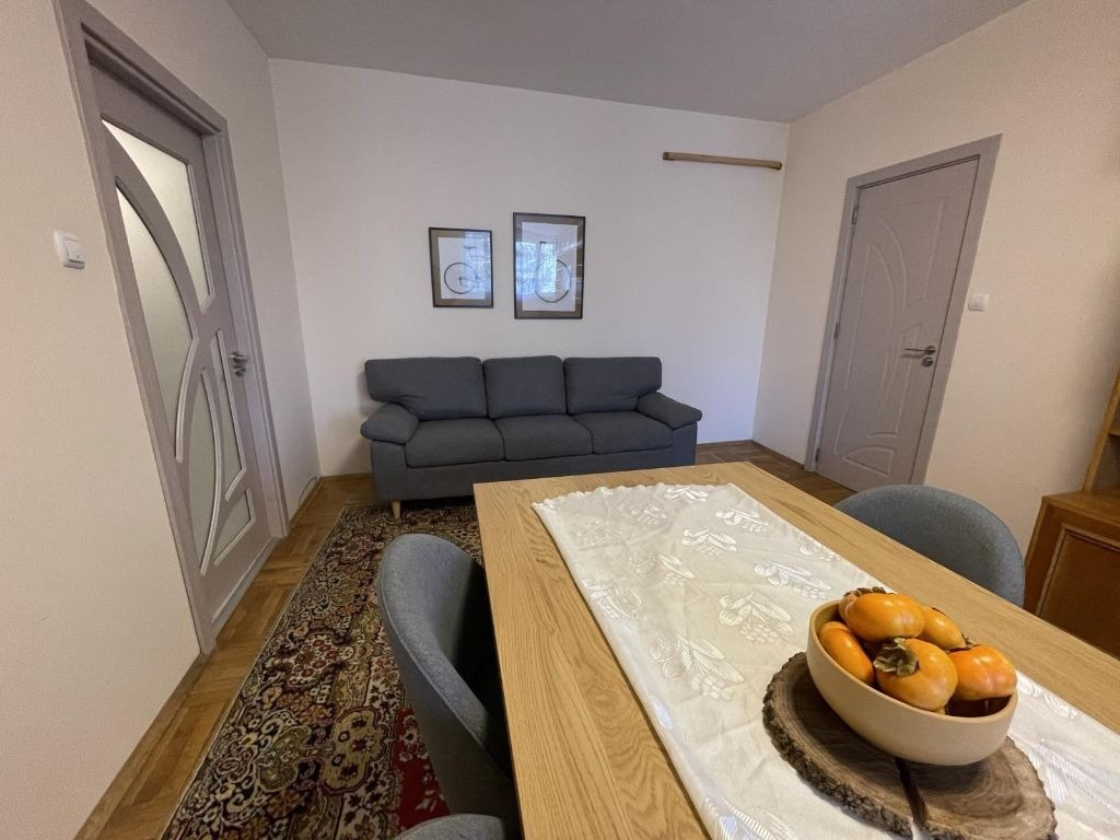 Разпределение: входно антре в ляво кухня с трапезария, която може да се обзавиде по желание на наемателя,тоалетна, дневна-секция, диван от дневната влиза се в коридор -две спални срещу положни, като едната е с тераса към вътрешен двор много добре поддържан, баня с тоалетна.