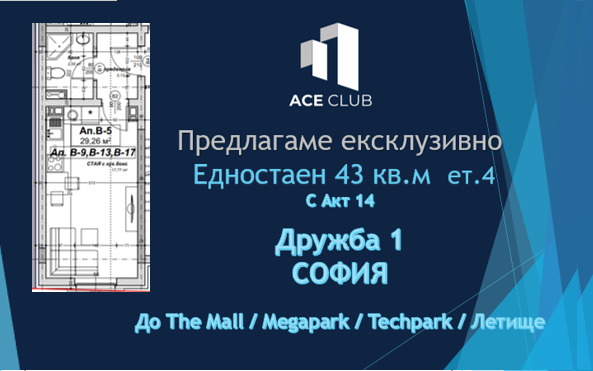 Ace club предлагаме есклузивно, просторен едностаен апартамент с площ 43 кв м., в новoстрояща се сграда, в жк Дружба 1. Сградата е с издаден Акт 14, очакван Акт 16 през септември 2026.