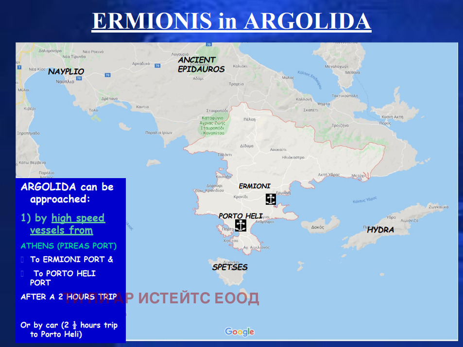 Районът е известен с луксозни вили, курорти и яхтени пристанища и се намира в близост до космополитните острови Hydra и Spetses, както и до историческия град Nafplio. Имотът се намира и близо до световноизвестния курорт Amanzoe Resort, един от най-ексклузивните в Гърция.