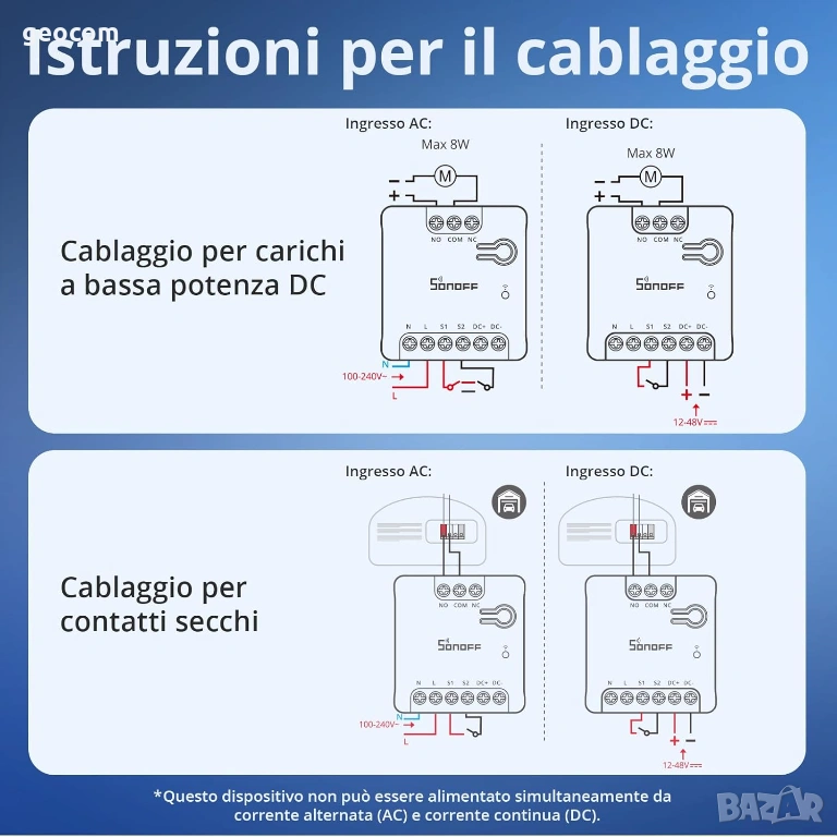 SONOFF MINI-D Smart WiFi превключвател (AC/DC 12-48V, сух контакт) SONOFF MINI-D е компактен WiFi превключвател с безпотенциален контакт, който ви позволява да управлявате различни интелигентни домашни устройства. Благодарение на съвместимостта си със стандарта Matter, той работи с популярни интелигентни домашни екосистеми като Google Home, Apple Home и Amazon Alexa, осигурявайки удобен контрол и широка съвместимост. Модулът поддържа AC 100-240V (0.1A) или DC 12-48V (1A), което го прави идеален за автоматизиране на системи с ниско напрежение като гаражни врати, отоплителни системи, управление на вентили или управление на големи товари чрез контактори. Вграденият 2.4GHz WiFi (IEEE 802.11 b/g/n) и усъвършенстван ESP32 чип гарантират стабилна комуникация и отзивчивост. Съвместимост с Matter Превключвателят SONOFF MINI-D поддържа стандарта Matter, така че безпроблемно се интегрира с основни интелигентни домашни системи като Google Home, Apple Home и Amazon Alexa. В резултат на това можете удобно да управлявате вашите устройства, независимо от предпочитаната от вас платформа. Възможността за интегриране с Home Assistant допълнително подобрява функционалността. Устройството също поддържа графици и сценарии за автоматизация. С функцията таймер, например, е възможно да се настрои автоматично изключване на устройствата в определен час, което повишава безопасността и спестява енергия. Допълнително удобство осигурява функцията за групово управление. По-голяма гъвкавост на управлението Безпотенциалният контакт, с който е оборудван превключвателят, ви позволява да управлявате устройства, които изискват сигнал за отваряне/затваряне на веригата, без да се прилага напрежение. Това прави модула приложим в широк спектър от ситуации – от управление на гаражни врати и отоплителни системи до управление на вентили или електрически брави. Електрическата изолация на веригата осигурява по-голяма безопасност и елиминира риска от повреда на управляваните устройства. Много възможности Устройството поддържа както променливо напрежение (AC), така и постоянно напрежение (DC) в диапазона от 12-48V (1A) или 100-240V AC (0.1A), което позволява интеграция с различни системи за управление. Способността на модула да се захранва както от домашна инсталация, така и от захранвания с ниско напрежение, прави SONOFF MINI-D идеален избор за професионални инсталации в сгради и индустриална автоматизация. Управление от всяко място Едно от основните приложения на MINI-D е дистанционно управление на гаражни врати. Когато се интегрира с приложение за интелигентен дом, можете да отваряте и затваряте портата от всяко място за удобство и сигурност. Комбинирането на превключвателя с камера за наблюдение ви позволява да проверявате състоянието на портата в реално време, минимизирайки риска от оставянето й отворена. Интеграция с отоплителни системи MINI-D работи и със системи за управление на котли, термостати или радиатори, така че също доказва своята стойност в интелигентното управление на отоплението. Възможността за програмиране на графици и дистанционно управление позволява по-добър контрол на температурата в къщата, намаляване на потреблението на енергия и по-ниски сметки за отопление. Модулът може да работи и в сценарии за автоматизация, като например включване на отопление само когато е необходимо. Управление на големи товари Реле с ниска консумация на ток (2A) може да се използва 
